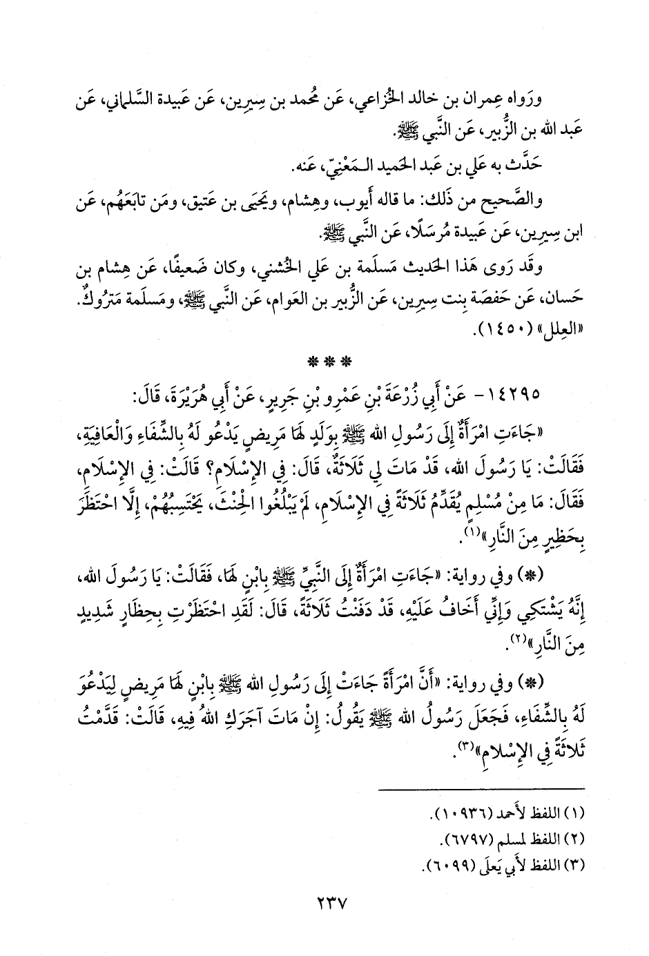 - وفي رواية: «أن امرأة جاءت إلى رسول الله صَلى الله عَليه وسَلم بابن لها مريض ليدعو له بالشفاء، فجعل رسول الله صَلى الله عَليه وسَلم يقول: إن مات آجرك الله فيه، قالت: قدمت ثلاثة في الإسلام» (¬٣).