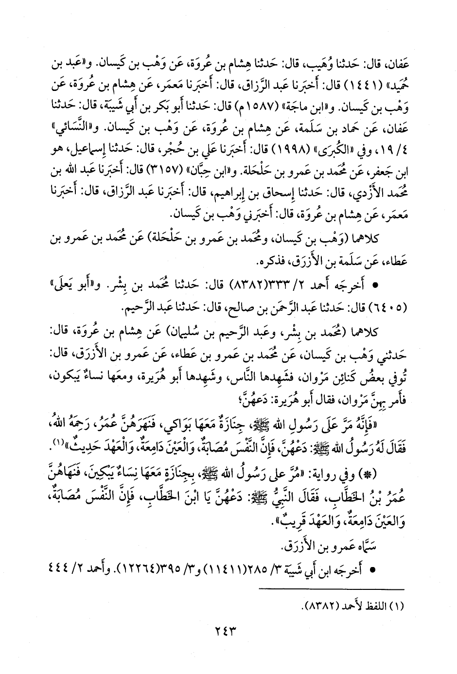 كلاهما (محمد بن بشر، وعبد الرحيم بن سليمان) عن هشام بن عروة، قال: حدثني وهب بن كَيْسان، عن محمد بن عَمرو بن عطاء، عن عَمرو بن الأزرق، قال: توفي بعض كنائن مروان، فشهدها الناس، وشهدها أَبو هريرة، ومعها نساء يبكون، فأمر بهن مروان، فقال أَبو هريرة: دعهن؛