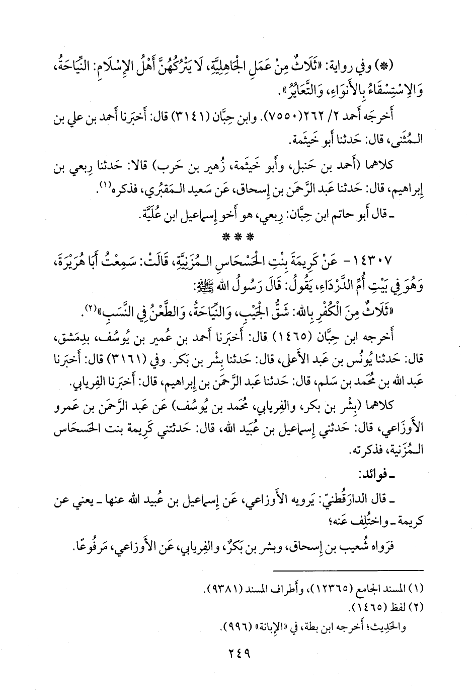١٤٣٠٧ - عن كريمة بنت الحسحاس المزنية، قالت: سمعت أبا هريرة، وهو في بيت أم الدرداء، يقول: قال رسول الله صَلى الله عَليه وسَلم: