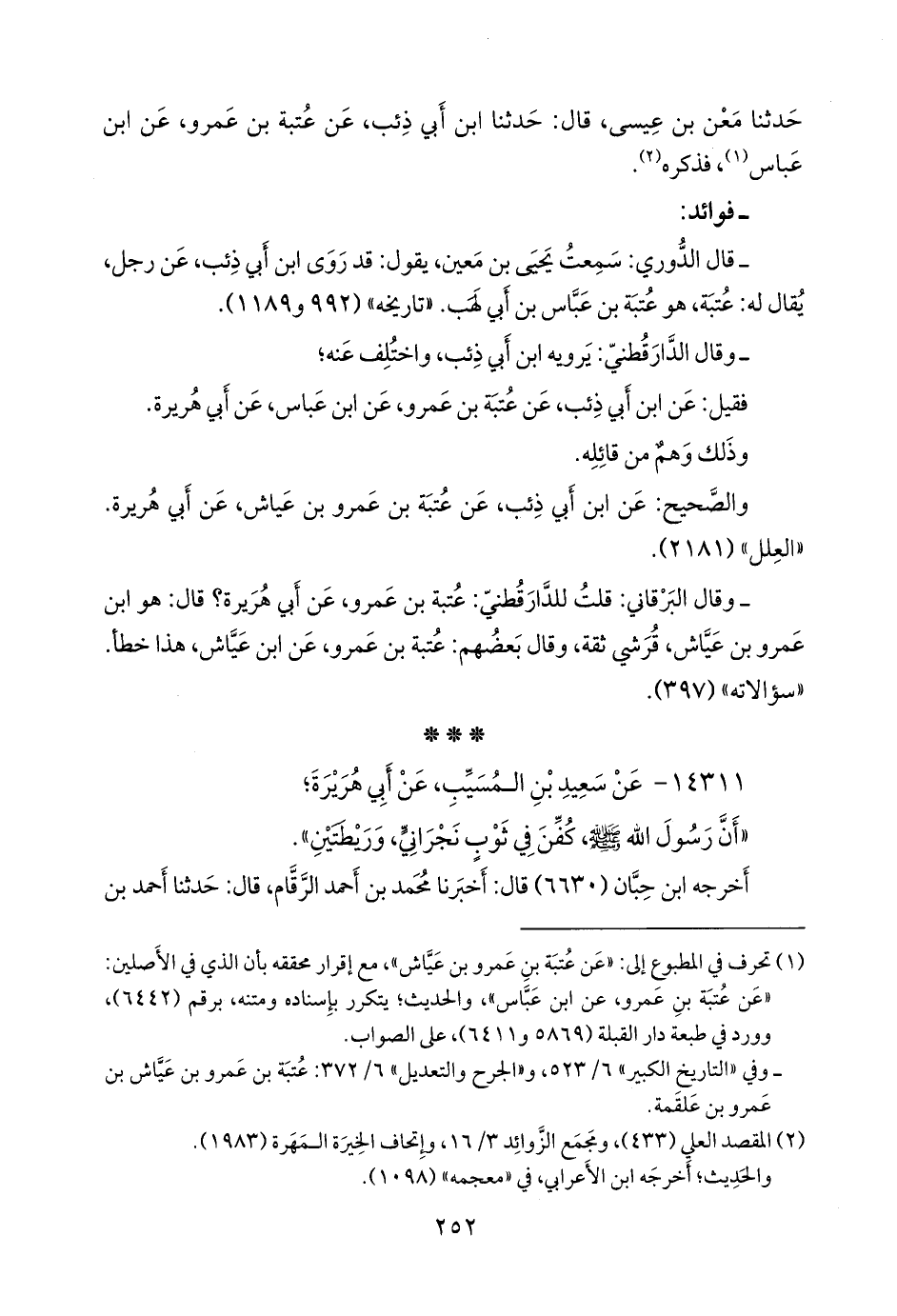 - وقال البَرقاني: قلت للدارقطني: عتبة بن عَمرو، عن أبي هريرة؟ قال: هو ابن عَمرو بن عياش، قرشي ثقة، وقال بعضهم: عتبة بن عَمرو، عن ابن عياش، هذا خطأ. «سؤالاته» (٣٩٧).