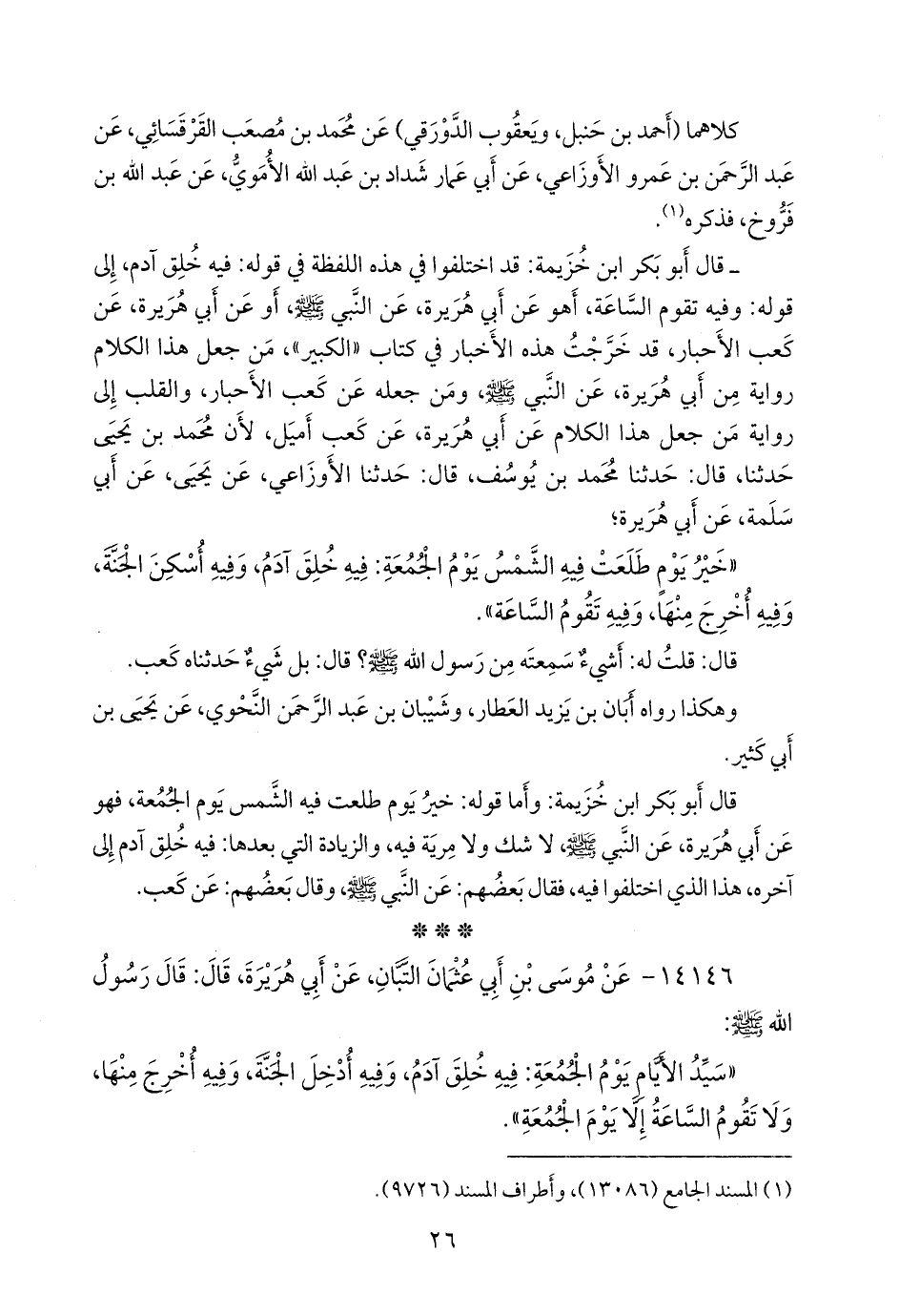 - قال ابن خزيمة: غلطنا في إخراج هذا الحديث، لأن هذا مرسل، موسى بن أبي عثمان لم يسمع من أبي هريرة، أَبوه أَبو عثمان التبان روى عن أبي هريرة أخبارا سمعها منه.
