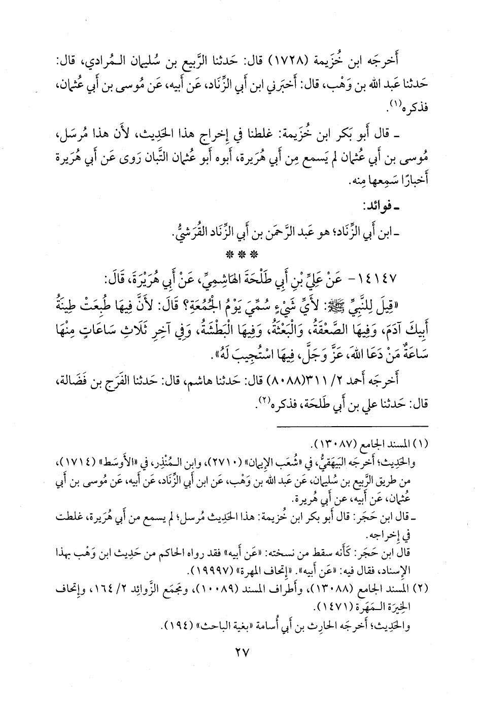 (¬١) المسند الجامع (١٣٠٨٨)، وأطراف المسند (١٠٠٨٩)، ومَجمَع الزوائد ٢/ ١٦٤، وإتحاف الخِيرَة المَهَرة (١٤٧١).