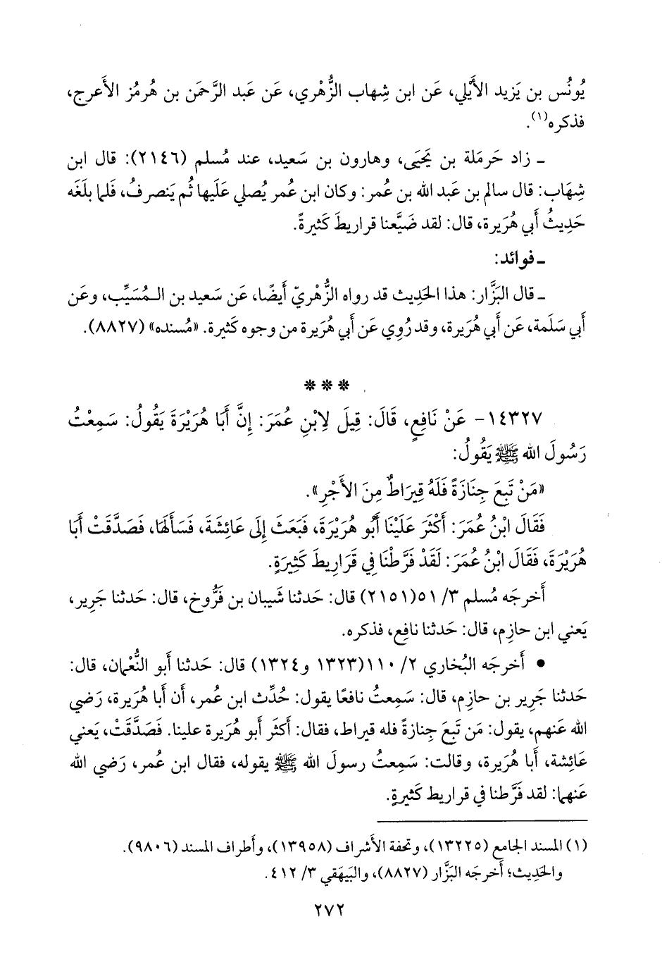 • أَخرجه البخاري ٢/ ١١٠ (١٣٢٣ و ١٣٢٤) قال: حدثنا أَبو النعمان، قال: حدثنا جَرير بن حازم، قال: سمعت نافعا يقول: حدث ابن عمر، أن أبا هريرة، رضي الله عنهم، يقول: من تبع جِنازة فله قيراط، فقال: أكثر أَبو هريرة علينا. فصدقت، يعني عائشة، أبا هريرة، وقالت: سمعت رسول الله صَلى الله عَليه وسَلم يقوله، فقال ابن عمر، رضي الله عنهما: لقد فرطنا في قراريط كثيرة.