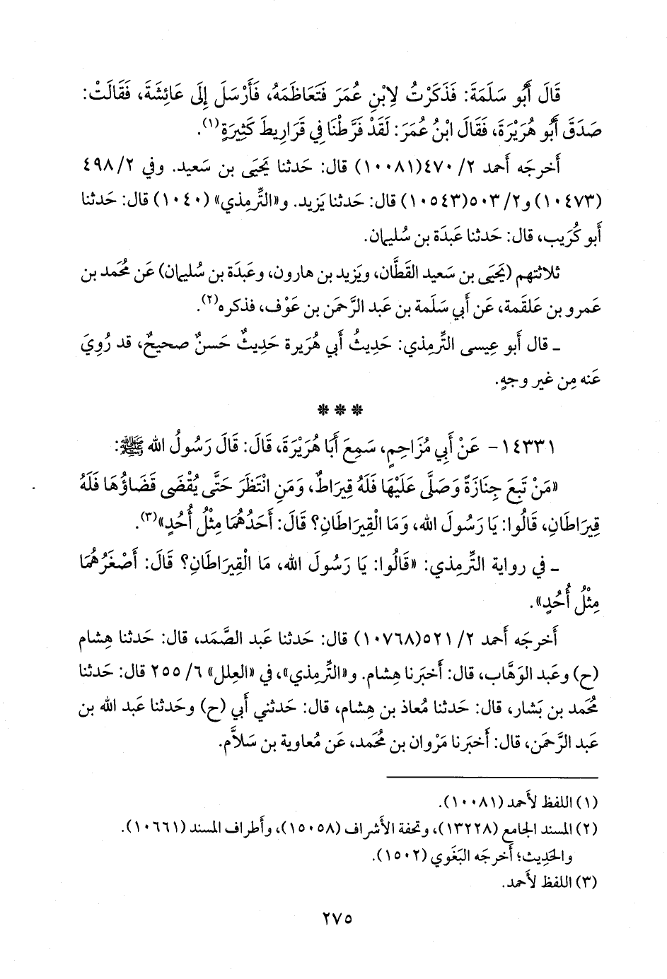 - في رواية التِّرمِذي: «قالوا: يا رسول الله، ما القيراطان؟ قال: أصغرهما مثل أحد».