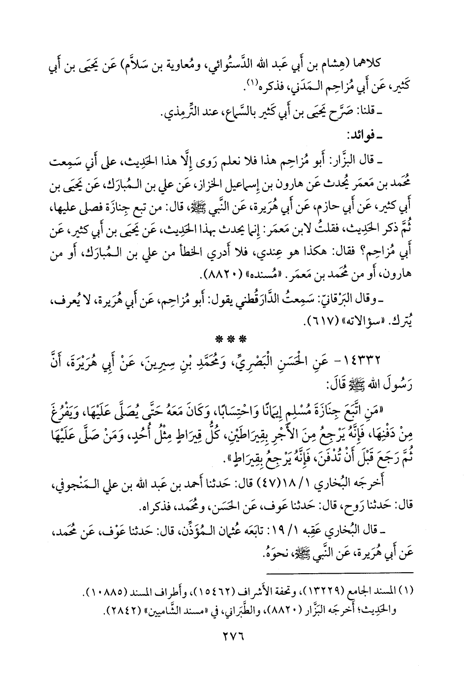 - قال البزار: أَبو مزاحم هذا فلا نعلم روى إلا هذا الحديث، على أني سمعت محمد بن معمر يحدث عن هارون بن إسماعيل الخزاز، عن علي بن المبارك، عن يحيى بن أبي كثير، عن أبي حازم، عن أبي هريرة، عن النبي صَلى الله عَليه وسَلم قال: من تبع جِنازة فصلى عليها، ثم ذكر الحديث، فقلت لابن معمر: إنما يحدث بهذا الحديث، عن يحيى بن أبي كثير، عن أبي مزاحم؟ فقال: هكذا هو عندي، فلا أدري الخطأ من علي بن المبارك، أو من هارون، أو من محمد بن معمر. «مسنده» (٨٨٢٠).