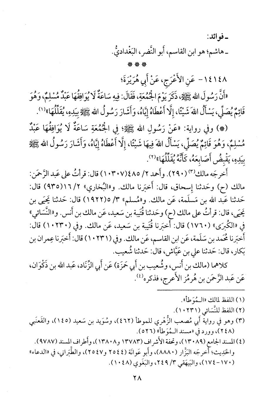 - وفي رواية: «عن رسول الله صَلى الله عَليه وسَلم؛ في الجمعة ساعة لا يوافقها عبد مسلم، وهو قائم يصلي، يسأل الله فيها شيئا، إلا أعطاه إياه، وأشار رسول الله صَلى الله عَليه وسَلم بيده، يقبض أصابعه، كأنه يقللها» (¬٢).