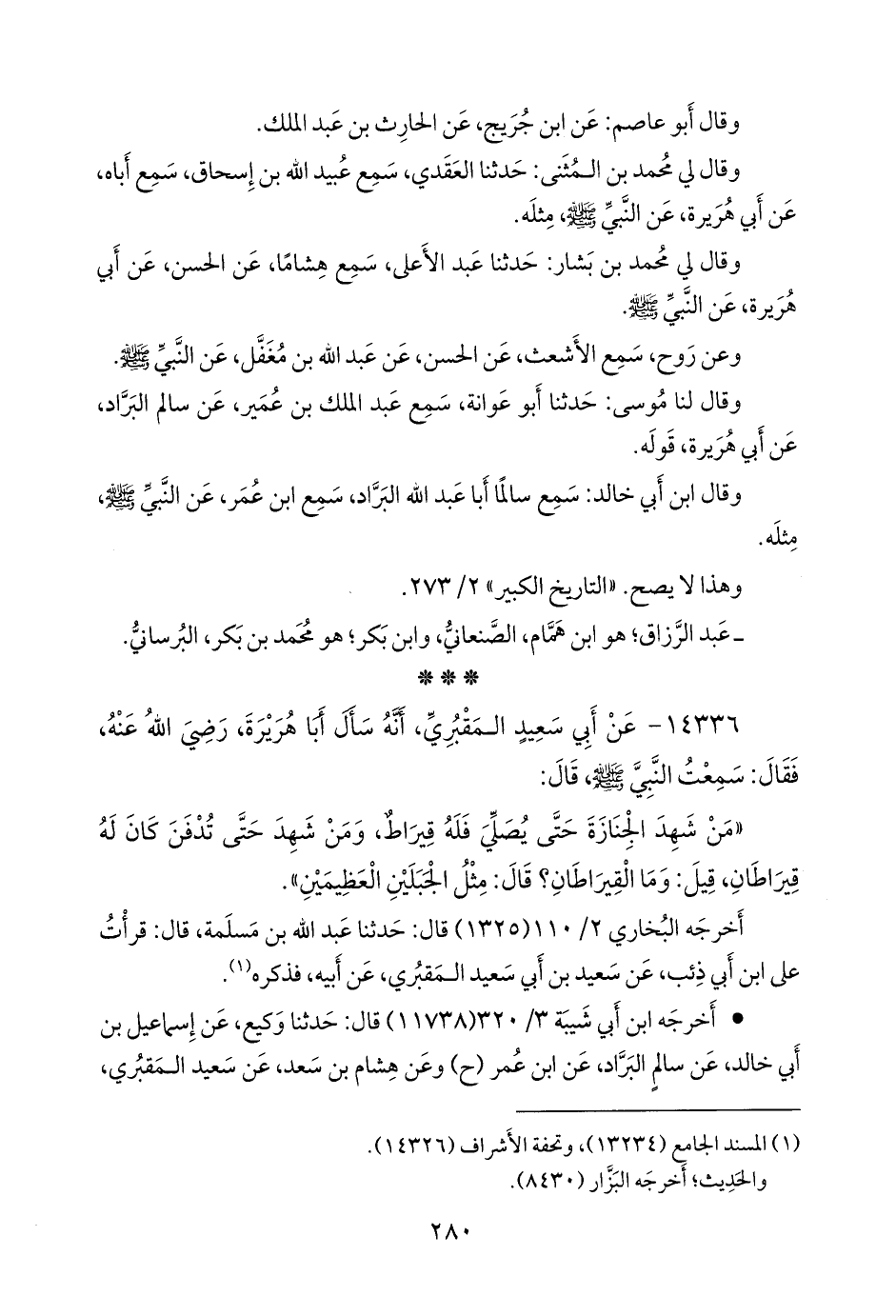 عن أبي هريرة (ح) وعن أبيه، عن عاصم، عن زر، عن عبد الله، قالوا: من صلى على جِنازة، فله قيراط، ومن شهدها حتى يقضى قضاؤها، فله قيراطان, القيراط مثل أحد. «موقوف».