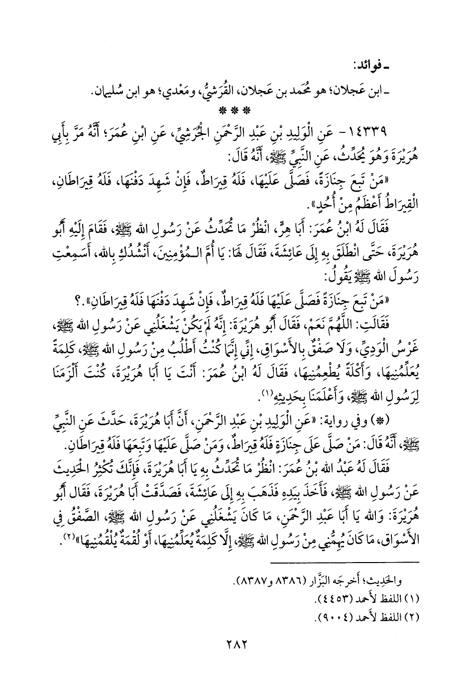 - وفي رواية: «عن الوليد بن عبد الرَّحمَن، أن أبا هريرة، حدث عن النبي صَلى الله عَليه وسَلم أنه قال: من صلى على جِنازة فله قيراط، ومن صلى عليها وتبعها فله قيراطان.