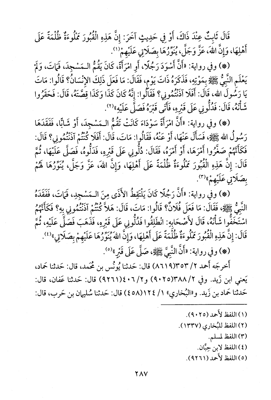 - وفي رواية: «أن امرأة سوداء كانت تقم المسجد، أو شابا، ففقدها رسول الله صَلى الله عَليه وسَلم فسأل عنها، أو عنه، فقالوا: مات، قال: أفلا كنتم آذنتموني؟ قال: فكأنهم صغروا أمرها، أو أمره، فقال: دلوني على قبره، فدلوه، فصلى عليها، ثم قال: إن هذه القبور مملوءة ظلمة على أهلها، وإن الله، عز وجل، ينورها لهم بصلاتي عليهم» (¬١).