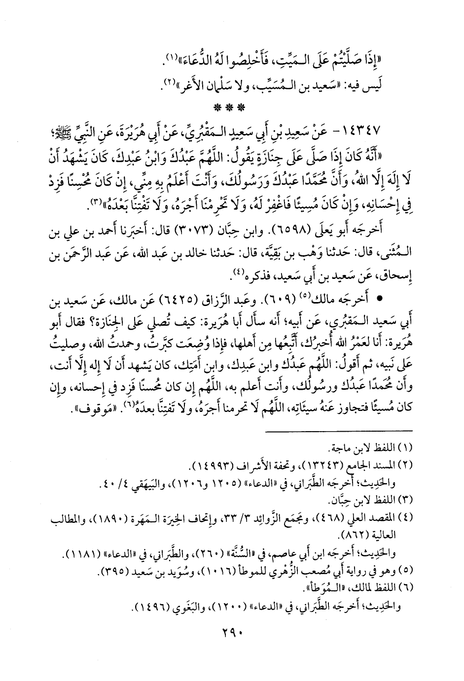 • وأخرجه ابن أبي شيبة (١١٤٩٥) قال: حدثنا عَبدة بن سليمان، عن يحيى بن سعيد، عن سعيد بن أبي سعيد المَقبُري؛ أن رجلا سأل أبا هريرة، فقال: كيف تصلي على الجِنازة؟ فقال أَبو هريرة: أنا لعمر الله أخبرك، أكبر، ثم أصلي على النبي صَلى الله عَليه وسَلم ثم أقول: اللهم عبدك، أو أمتك، كان يعبدك، لا يشرك بك شيئا، وأنت أعلم به، إن كان محسنا فزد في إحسانه، وإن كان مخطئا فتجاوز عنه، اللهم لا تفتنا بعده، ولا تحرمنا أجره. «موقوف»، ولم يقل سعيد بن أبي سعيد: «عن أبيه» (¬٥).