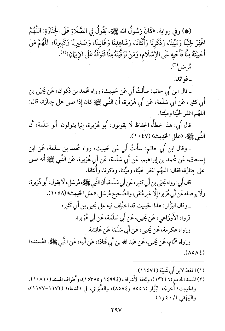 - وقال ابن أبي حاتم: سألتُ أبي عن حديثٍ؛ رواه محمد بن سلمة، عن ابن إسحاق، عن محمد بن إبراهيم، عن أبي سلمة، عن أبي هريرة، عن النبي صَلى الله عَليه وسَلم أنه صلى على جِنازة، فقال: اللهم اغفر لحينا، وميتنا، وذكرنا، وأنثانا.