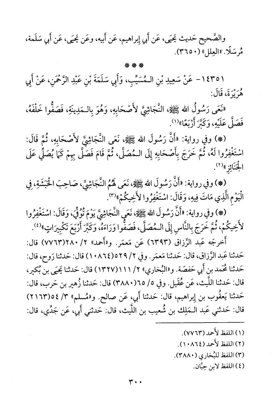 - وفي رواية: «أن رسول الله صَلى الله عَليه وسَلم نعى النجاشي يوم توفي، وقال: استغفروا لأخيكم، ثم خرج بالناس إلى المصلى، فصفوا وراءه، وكبر أربع تكبيرات» (¬٤).