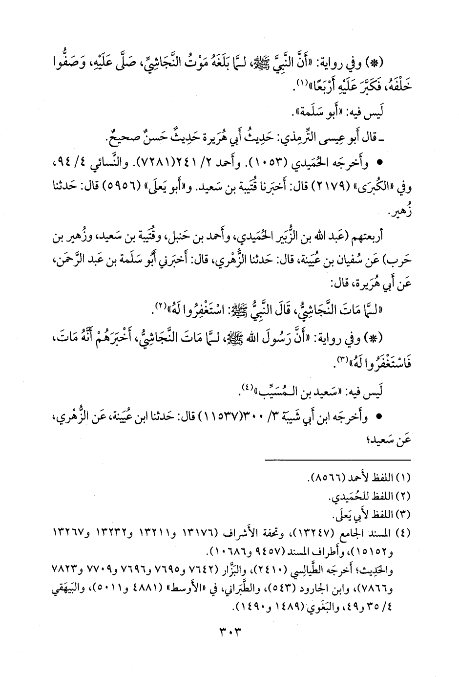 - وفي رواية: «أن النبي صَلى الله عَليه وسَلم لما بلغه موت النجاشي، صلى عليه، وصفوا خلفه، فكبر عليه أربعا» (¬١).