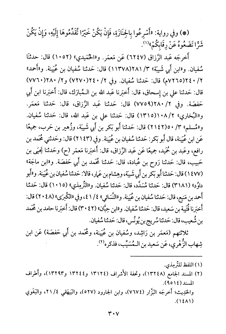 و «مسلم» ٣/ ٥٠ (٢١٤٢) قال: حدثنا أَبو بكر بن أبي شيبة، وزهير بن حرب، جميعا عن ابن عُيينة، قال أَبو بكر: حدثنا سفيان بن عُيينة. وفي (٢١٤٣) قال: وحدثني محمد بن رافع، وعَبد بن حُميد، جميعا عن عبد الرزاق، قال: أخبرنا مَعمَر (ح) وحدثنا يحيى بن حبيب، قال: حدثنا روح بن عبادة، قال: حدثنا محمد بن أبي حفصة. و «ابن ماجة» (١٤٧٧) قال: حدثنا أَبو بكر بن أبي شيبة، وهشام بن عمار، قالا: حدثنا سفيان بن عُيينة. و «أَبو داود» (٣١٨١) قال: حدثنا مُسدد، قال: حدثنا سفيان. و «التِّرمِذي» (١٠١٥) قال: حدثنا أحمد بن مَنيع، قال: حدثنا سفيان بن عُيينة. و «النَّسَائي» ٤/ ٤١، وفي «الكبرى» (٢٠٤٨) قال: أخبرنا قتيبة بن سعيد، قال: حدثنا سفيان. و «ابن حِبَّان» (٣٠٤٢) قال: أخبرنا حامد بن محمد بن شعيب، قال: حدثنا سريج بن يونس، قال: حدثنا سفيان.