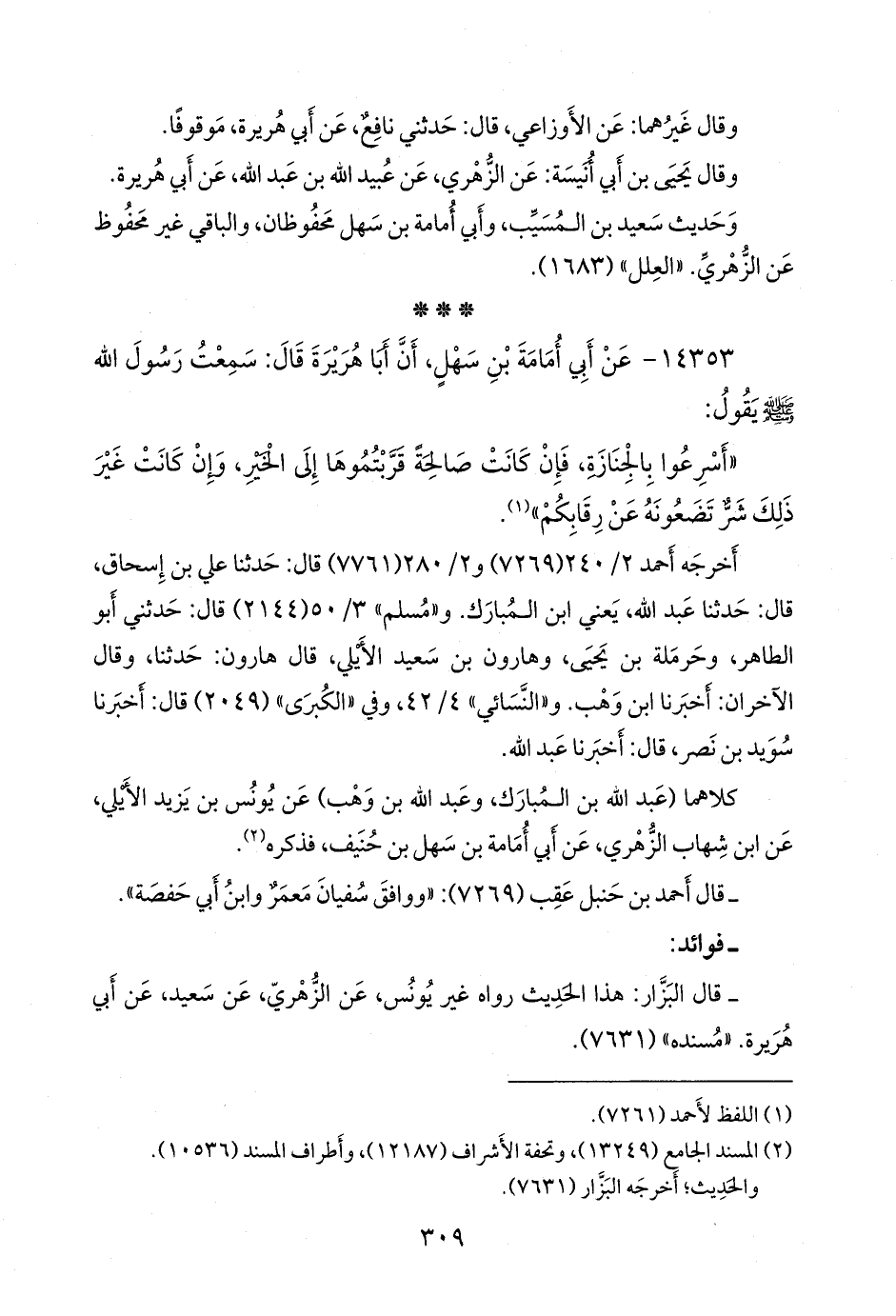 - قال أحمد بن حنبل عقب (٧٢٦٩): «ووافق سفيان معمر وابن أبي حفصة».
