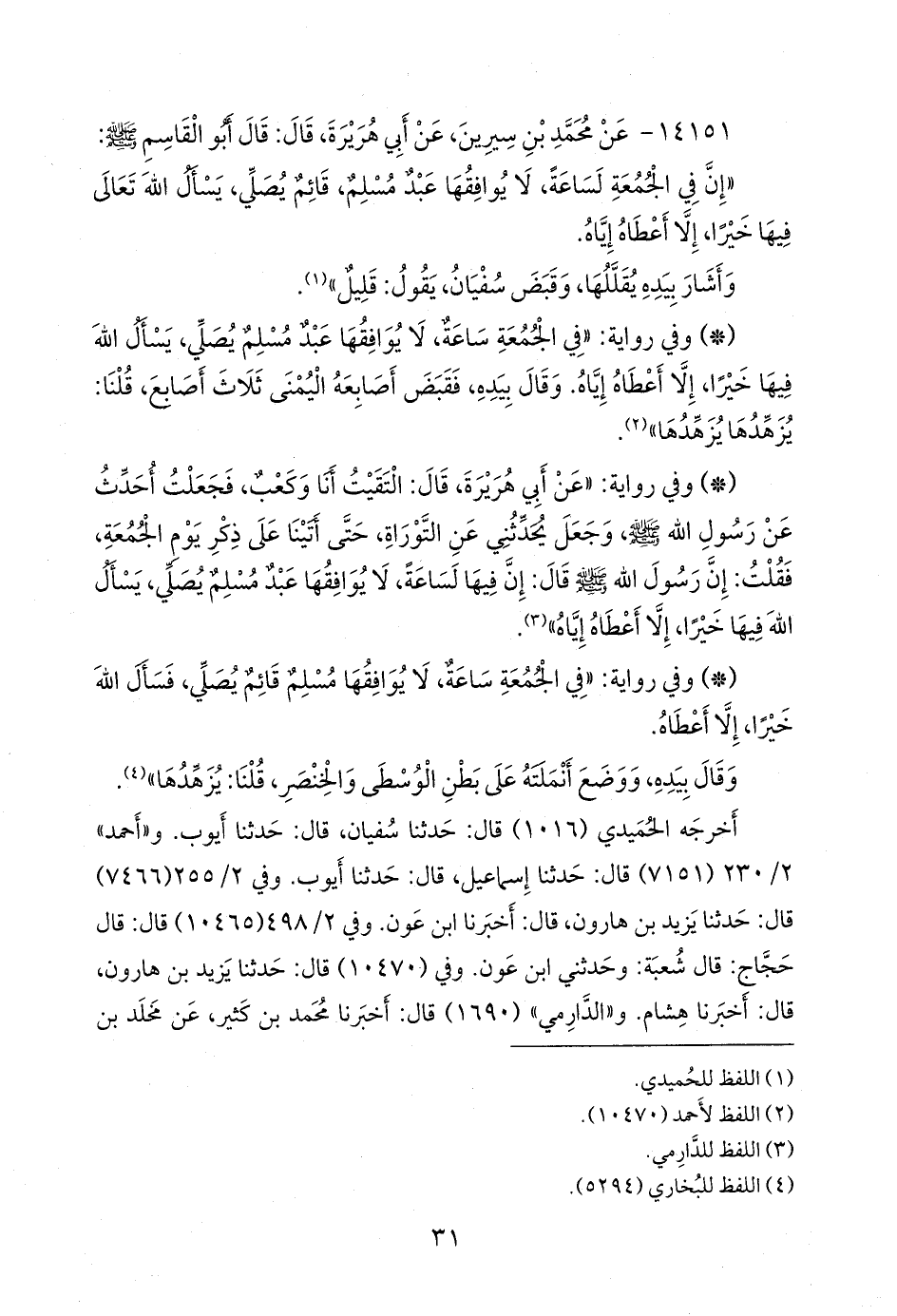 - وفي رواية: «في الجمعة ساعة، لا يوافقها مسلم قائم يصلي، فسأل الله خيرا، إلا أعطاه.