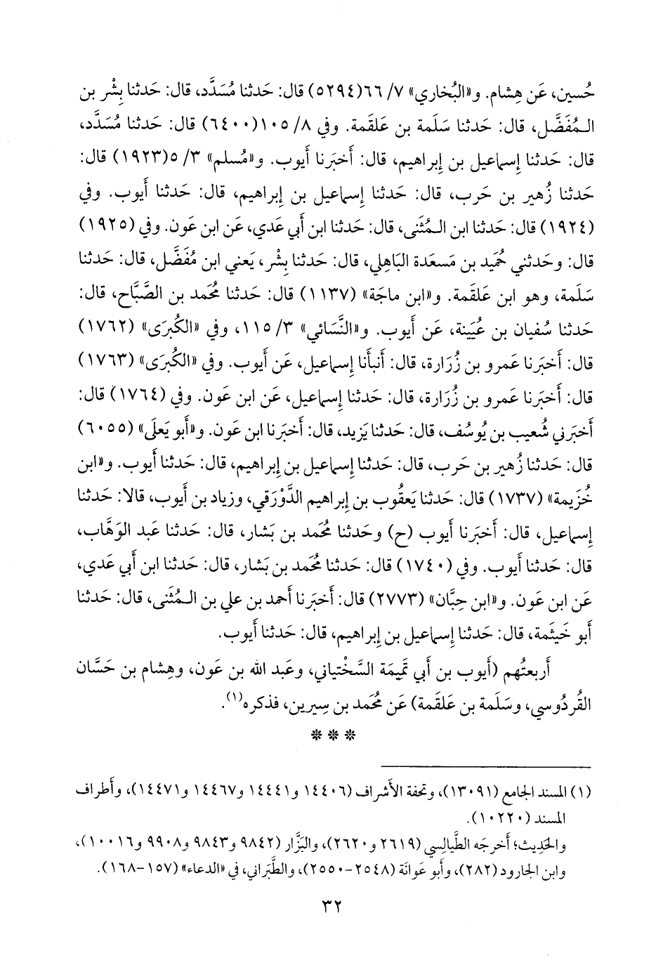 و «البخاري» ٧/ ٥١ (٥٢٩٤) قال: حدثنا مُسدد، قال: حدثنا بشر بن المُفَضَّل، قال: حدثنا سلمة بن علقمة. وفي ٨/ ٨٥ (٦٤٠٠) قال: حدثنا مُسدد، قال: حدثنا إسماعيل بن إبراهيم، قال: أخبرنا أيوب. و «مسلم» ٣/ ٥ (١٩٢٣) قال: حدثنا زهير بن حرب، قال: حدثنا إسماعيل بن إبراهيم، قال: حدثنا أيوب. وفي (١٩٢٤) قال: حدثنا ابن المثنى، قال: حدثنا ابن أَبي عَدي، عن ابن عَون. وفي (١٩٢٥) قال: وحدثني حميد بن مَسعَدة الباهلي، قال: حدثنا بشر، يعني ابن مفضل، قال: حدثنا سلمة، وهو ابن علقمة. و «ابن ماجة» (١١٣٧) قال: حدثنا محمد بن الصباح، قال: حدثنا سفيان بن عُيينة، عن أيوب. و «النَّسَائي» ٣/ ١١٥، وفي «الكبرى» (١٧٦٢) قال: أخبرنا عَمرو بن زُرارة، قال: أنبأنا إسماعيل، عن أيوب. وفي «الكبرى» (١٧٦٣) قال: أخبرنا عَمرو بن زُرارة، قال: حدثنا إسماعيل، عن ابن عَون. وفي (١٧٦٤) قال: أخبرني شعيب بن يوسف، قال: حدثنا يزيد، قال: أخبرنا ابن عَون. و «أَبو يَعلى» (٦٠٥٥) قال: حدثنا زهير بن حرب، قال: حدثنا إسماعيل بن إبراهيم، قال: حدثنا أيوب. و «ابن خزيمة» (١٧٣٧) قال: حدثنا يعقوب بن إبراهيم الدورقي، وزياد بن أيوب، قالا: حدثنا إسماعيل، قال: أخبرنا أيوب (ح) وحدثنا محمد بن بشار، قال: حدثنا عبد الوَهَّاب، قال: حدثنا أيوب. وفي (١٧٤٠) قال: حدثنا محمد بن بشار، قال: حدثنا ابن أَبي عَدي، عن ابن عَون. و «ابن حِبَّان» (٢٧٧٣) قال: أخبرنا أحمد بن علي بن المثنى، قال: حدثنا أَبو خيثمة، قال: حدثنا إسماعيل بن إبراهيم، قال: حدثنا أيوب.