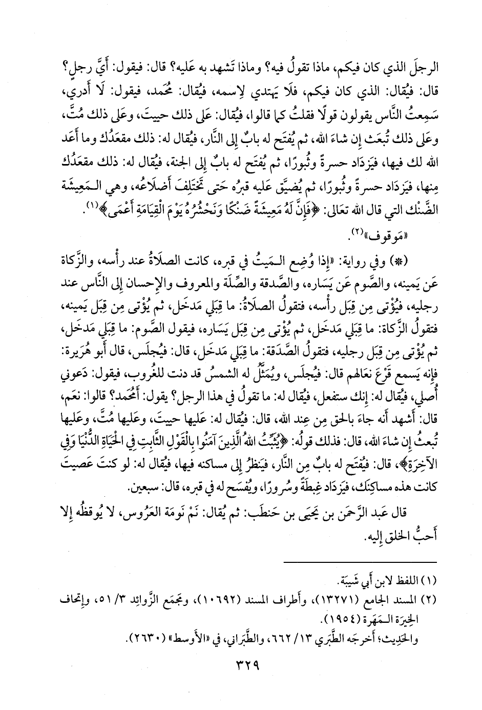 - وفي رواية: «إذا وضع الميت في قبره، كانت الصلاة عند رأسه، والزكاة عن يمينه، والصوم عن يساره، والصدقة والصلة والمعروف والإحسان إلى الناس عند رجليه، فيؤتى من قبل رأسه، فتقول الصلاة: ما قبلي مدخل، ثم يؤتى من قبل يمينه، فتقول الزكاة: ما قبلي مدخل، ثم يؤتى من قبل يساره، فيقول الصوم: ما قبلي مدخل، ثم يؤتى من قبل رجليه، فتقول الصدقة: ما قبلي مدخل، قال: فيجلس، قال أَبو هريرة: فإنه يسمع قرع نعالهم قال: فيجلس، ويمثل له الشمس قد دنت للغروب، فيقول: دعوني أصلي، فيقال له: إنك ستفعل، فيقال له: ما تقول في هذا الرجل؟ يقول: أمحمد؟ قالوا: نعم، قال: أشهد أنه جاء بالحق من عند الله، قال: فيقال له: عليها حييت، وعليها مت، وعليها تبعث إن شاء الله، قال: فذلك قوله: {يثبت الله الذين آمنوا بالقول الثابت في الحياة الدنيا وفي الآخرة}، قال: فيفتح له باب من النار، فينظر إلى مساكنه فيها، فيقال له: لو كنت عصيت كانت هذه مساكنك، فيزداد غبطة وسرورا، ويفسح له في قبره، قال: سبعين.