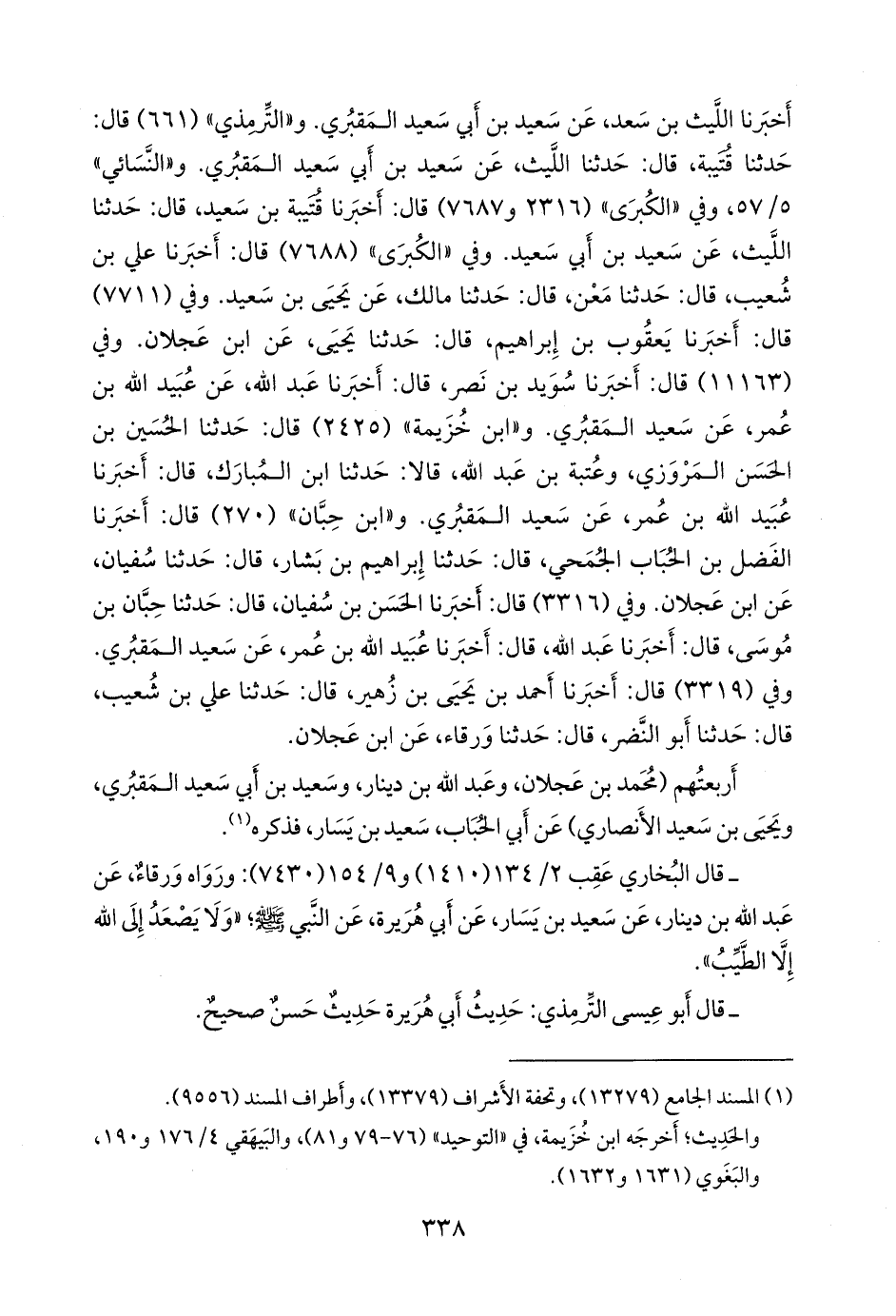 وفي «الكبرى» (٧٦٨٨) قال: أخبرنا علي بن شعيب، قال: حدثنا مَعْن، قال: حدثنا مالك، عن يحيى بن سعيد. وفي (٧٧١١) قال: أخبرنا يعقوب بن إبراهيم، قال: حدثنا يحيى، عن ابن عَجلان. وفي (١١١٦٣) قال: أخبرنا سويد بن نصر، قال: أخبرنا عبد الله، عن عُبيد الله بن عمر، عن سعيد المَقبُري. و «ابن خزيمة» (٢٤٢٥) قال: حدثنا الحسين بن الحسن المَرْوَزي، وعتبة بن عبد الله، قالا: حدثنا ابن المبارك، قال: أخبرنا عُبيد الله بن عمر، عن سعيد المَقبُري. و «ابن حِبَّان» (٢٧٠) قال: أخبرنا الفضل بن الحُبَاب الجُمحي، قال: حدثنا إبراهيم بن بشار، قال: حدثنا سفيان، عن ابن عَجلان. وفي (٣٣١٦) قال: أخبرنا الحسن بن سفيان، قال: حدثنا حِبَّان بن موسى، قال: أخبرنا عبد الله، قال: أخبرنا عُبيد الله بن عمر، عن سعيد المَقبُري. وفي (٣٣١٩) قال: أخبرنا أحمد بن يحيى بن زهير، قال: حدثنا علي بن شعيب، قال: حدثنا أَبو النضر، قال: حدثنا ورقاء، عن ابن عَجلان.