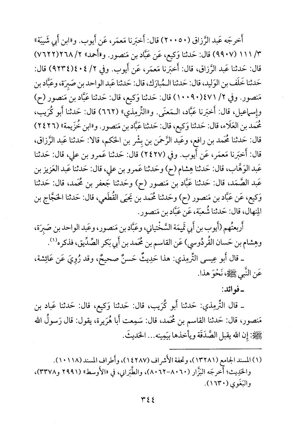 وفي ٢/ ٤٠٤ (٩٢٣٤) قال: حدثنا خلف بن الوليد، قال: حدثنا المبارك، قال: حدثنا عبد الواحد بن صبرة، وعباد بن منصور. وفي ٢/ ٤٧١ (١٠٠٩٠) قال: حدثنا وكيع، قال: حدثنا عباد بن منصور (ح) وإسماعيل، قال: أخبرنا عباد، المعنى. و «التِّرمِذي» (٦٦٢) قال: حدثنا أَبو كُريب محمد بن العلاء، قال: حدثنا وكيع، قال: حدثنا عباد بن منصور. و «ابن خزيمة» (٢٤٢٦) قال: حدثنا محمد بن رافع، وعبد الرَّحمَن بن بشر بن الحكم، قالا: حدثنا عبد الرزاق، قال: أخبرنا مَعمَر، عن أيوب. وفي (٢٤٢٧) قال: حدثنا عَمرو بن علي، قال: حدثنا عبد الوَهَّاب، قال: حدثنا هشام (ح) وحدثنا عَمرو بن علي، قال: حدثنا عبد العزيز بن عبد الصمد، قال: حدثنا عباد بن منصور (ح) وحدثنا جعفر بن محمد، قال: حدثنا وكيع، عن عباد بن منصور (ح) وحدثنا محمد بن يحيى القطعي، قال: حدثنا الحجاج بن المنهال، قال: حدثنا شعبة، عن عباد بن منصور.