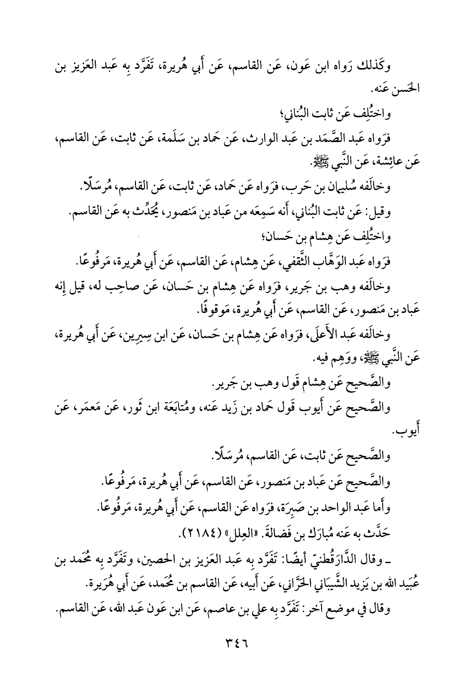 - وقال الدارقُطني: تفرد به عبد العزيز بن الحصين، وتفرد به محمد بن عُبيد الله بن يزيد الشيباني الحراني، عن أبيه، عن القاسم بن محمد، عن أبي هريرة.