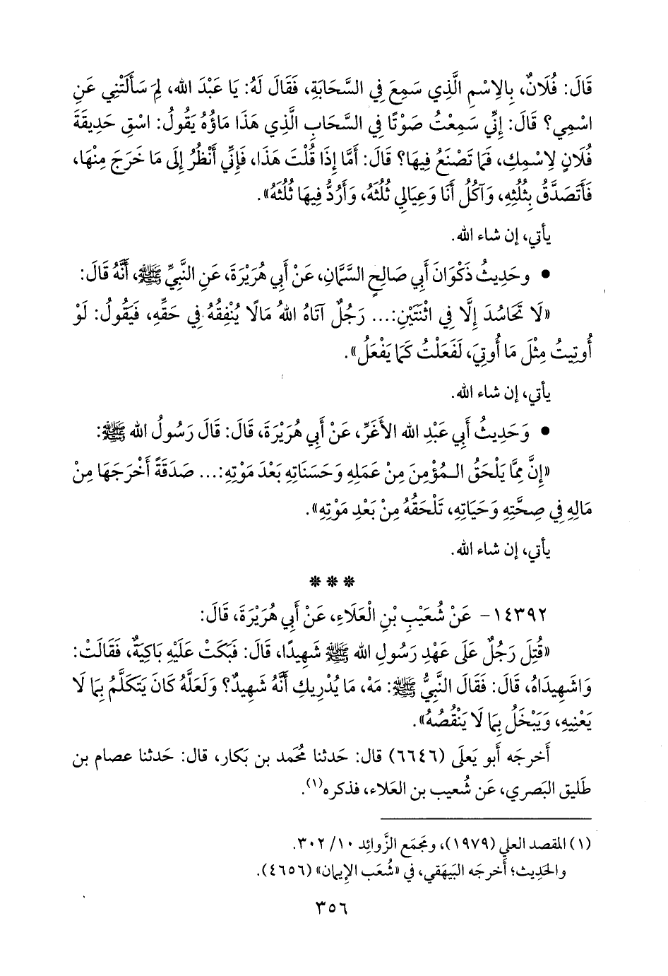 ١٤٣٩٢ - عن شعيب بن العلاء، عن أبي هريرة، قال: