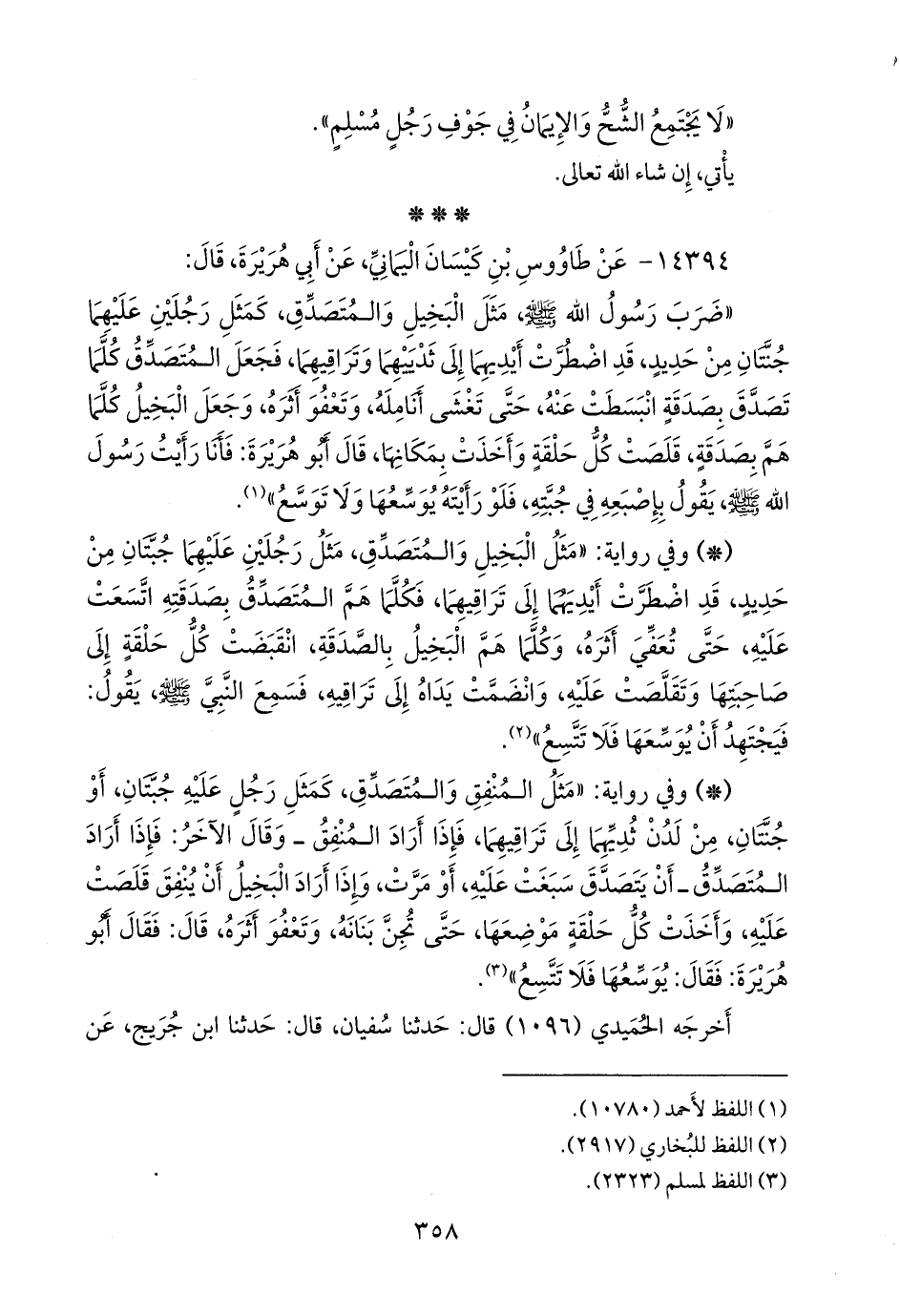 - وفي رواية: «مثل البخيل والمتصدق، مثل رجلين عليهما جبتان من حديد، قد اضطرت أيديهما إلى تراقيهما، فكلما هم المتصدق بصدقته اتسعت عليه، حتى تعفي أثره، وكلما هم البخيل بالصدقة، انقبضت كل حلقة إلى صاحبتها وتقلصت عليه، وانضمت يداه إلى تراقيه، فسمع النبي صَلى الله عَليه وسَلم يقول: فيجتهد أن يوسعها فلا تتسع» (¬٢).