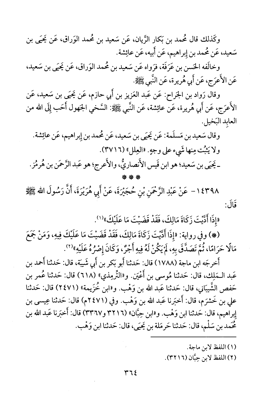 ١٤٣٩٨ - عن عبد الرَّحمَن بن حُجيرة، عن أبي هريرة، أن رسول الله صَلى الله عَليه وسَلم قال: