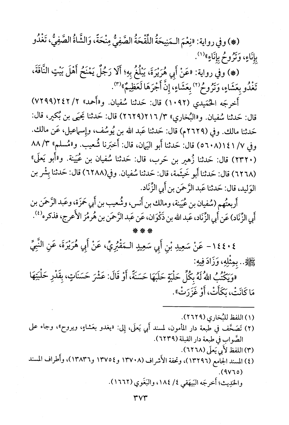 أخرجه الحُميدي (١٠٩٢) قال: حدثنا سفيان. و «أحمد» ٢/ ٢٤٢ (٧٢٩٩) قال: حدثنا سفيان. و «البخاري» ٣/ ٢١٦ (٢٦٢٩) قال: حدثنا يحيى بن بُكير، قال: حدثنا مالك. وفي (٢٦٢٩ م) قال: حدثنا عبد الله بن يوسف، وإسماعيل، عن مالك. وفي ٧/ ١٤١ (٥٦٠٨) قال: حدثنا أَبو اليمان، قال: أخبرنا شعيب. و «مسلم» ٣/ ٨٨ (٢٣٢٠) قال: حدثنا زهير بن حرب، قال: حدثنا سفيان بن عُيينة. و «أَبو يَعلى» (٦٢٦٨) قال: حدثنا أَبو خيثمة، قال: حدثنا سفيان. وفي (٦٢٨٨) قال: حدثنا بشر بن الوليد، قال: حدثنا عبد الرَّحمَن بن أبي الزناد.
