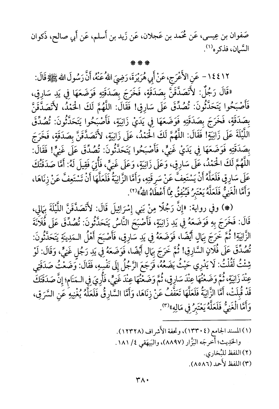 - وفي رواية: «إن رجلا من بني إسرائيل قال: لأتصدقن الليلة بمالي، قال: فخرج به فوضعه في يد زانية، فأصبح الناس يتحدثون: تصدق على فلانة الزانية! ثم خرج بمال أيضا، فوضعه في يد سارق، فأصبح أهل المدينة يتحدثون: تصدق على فلان السارق! ثم خرج بمال أيضا، فوضعه في يد رجل غني، وقال: لو شئت لقلت: لا يدري حيث يضعه، فرجع الرجل إلى نفسه، فقال: وضعت صدقتي عند زانية, ثم وضعتها عند سارق, ثم وضعتها عند غني, فأري في المنام؛ إن صدقتك قد قبلت، أما الزانية فلعلها تعفف عن زناها، وأما السارق فلعله يغنيه عن السرق، وأما الغني فلعله يعتبر في ماله» (¬٢).