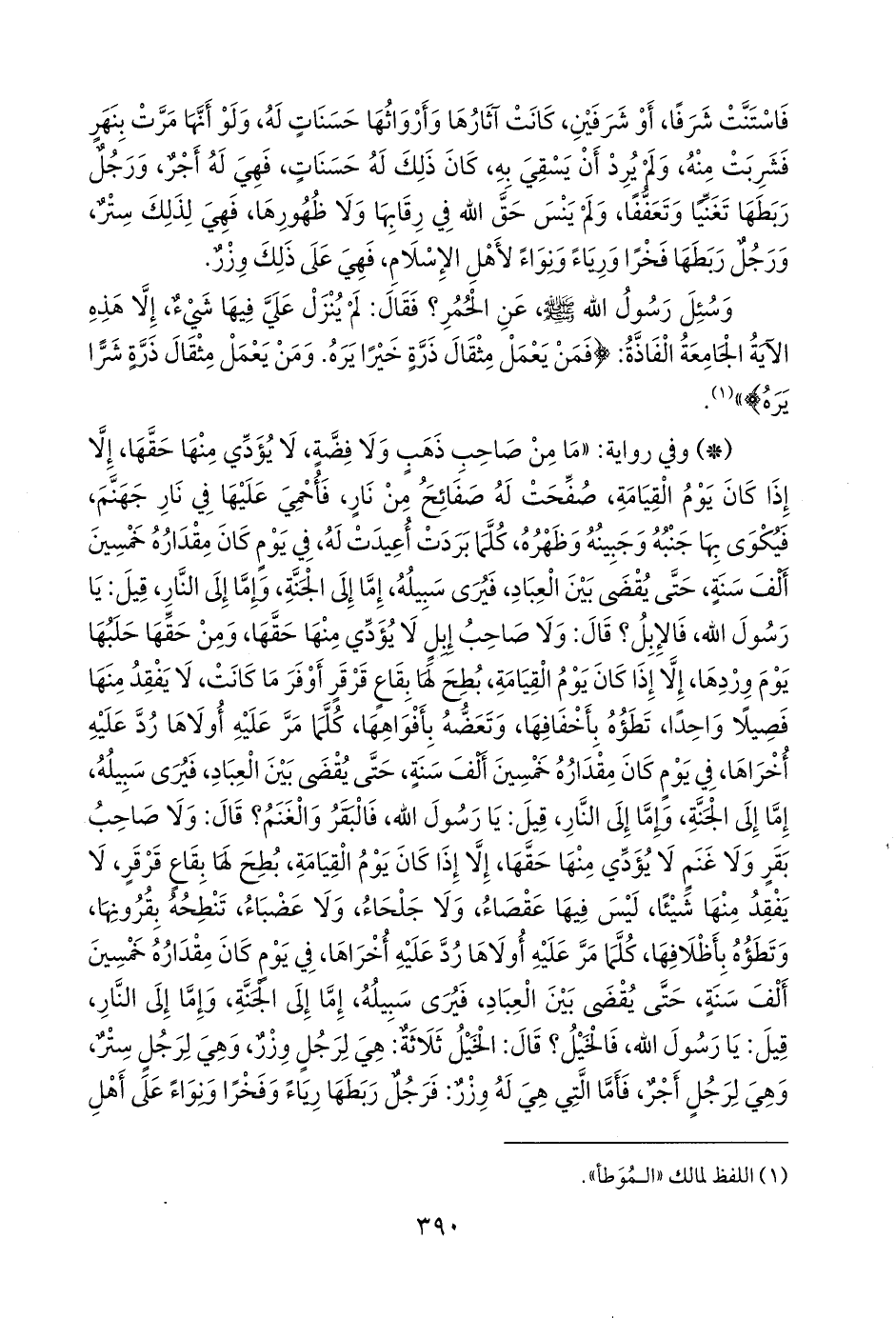 - وفي رواية: «ما من صاحب ذهب ولا فضة، لا يؤدي منها حقها، إلا إذا كان يوم القيامة، صفحت له صفائح من نار، فأحمي عليها في نار جهنم، فيكوى بها جنبه وجبينه وظهره، كلما بردت أعيدت له، في يوم كان مقداره خمسين ألف سنة، حتى يقضى بين العباد، فيرى سبيله، إما إلى الجنة، وإما إلى النار، قيل: يا رسول الله، فالإبل؟ قال: ولا صاحب إبل لا يؤدي منها حقها، ومن حقها حلبها يوم وردها، إلا إذا كان يوم القيامة، بطح لها بقاع قرقر أوفر ما كانت، لا يفقد منها فصيلا واحدا، تطؤه بأخفافها، وتعضه بأفواهها، كلما مر عليه أولاها رد عليه أخراها، في يوم كان مقداره خمسين ألف سنة، حتى يقضى بين العباد، فيرى سبيله، إما إلى الجنة، وإما إلى النار، قيل: يا رسول الله، فالبقر والغنم؟ قال: ولا صاحب بقر ولا غنم لا يؤدي منها حقها، إلا إذا كان يوم القيامة، بطح لها بقاع قرقر، لا يفقد منها شيئا، ليس فيها عقصاء، ولا جلحاء، ولا عضباء، تنطحه بقرونها، وتطؤه بأظلافها، كلما مر عليه أولاها رد عليه أخراها، في يوم كان مقداره خمسين ألف سنة، حتى يقضى بين العباد، فيرى سبيله، إما إلى الجنة، وإما إلى النار، قيل: يا رسول الله، فالخيل؟ قال: الخيل ثلاثة: هي لرجل وزر، وهي لرجل ستر، وهي لرجل أجر، فأما التي هي له وزر: فرجل ربطها رياء وفخرا ونواء على أهل