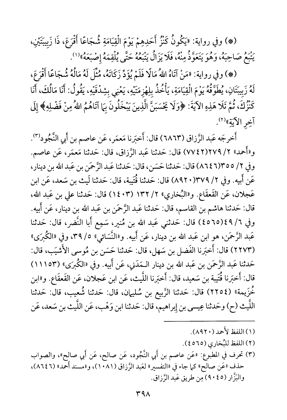 أخرجه عبد الرزاق (٦٨٦٣) قال: أخبرنا معمر، عن عاصم بن أبي النجود (¬١). و «أحمد» ٢/ ٢٧٩ (٧٧٤٢) قال: حدثنا عبد الرزاق، قال: حدثنا مَعمَر، عن عاصم. وفي ٢/ ٣٥٥ (٨٦٤٦) قال: حدثنا حسن، قال: حدثنا عبد الرَّحمَن بن عبد الله بن دينار، عن أبيه. وفي ٢/ ٣٧٩ (٨٩٢٠) قال: حدثنا قتيبة، قال: حدثنا ليث بن سعد، عن ابن عَجلان، عن القعقاع. و «البخاري» ٢/ ١٣٢ (١٤٠٣) قال: حدثنا علي بن عبد الله، قال: حدثنا هاشم بن القاسم، قال: حدثنا عبد الرَّحمَن بن عبد الله بن دينار، عن أبيه. وفي ٦/ ٤٩ (٤٥٦٥) قال: حدثني عبد الله بن منير، سمع أبا النضر، قال: حدثنا عبد الرَّحمَن، هو ابن عبد الله بن دينار، عن أبيه. و «النَّسَائي» ٥/ ٣٩، وفي «الكبرى» (٢٢٧٣) قال: أخبرنا الفضل بن سهل، قال: حدثنا حسن بن موسى الأشيب، قال: حدثنا عبد الرَّحمَن بن عبد الله بن دينار المدني، عن أبيه. وفي «الكبرى» (١١١٥٣) قال: أخبرنا قتيبة بن سعيد، قال: أخبرنا الليث، عن ابن عَجلان، عن القعقاع. و «ابن خزيمة» (٢٢٥٤) قال: حدثنا الربيع بن سليمان، قال: حدثنا شعيب، قال: حدثنا الليث (ح) وحدثنا عيسى بن إبراهيم، قال: حدثنا ابن وهب، عن الليث بن سعد، عن