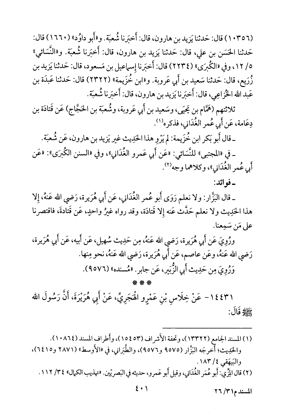 - قال البزار: ولا نعلم روى أَبو عمر الغُدَاني، عن أبي هريرة، رضي الله عنه، إلا هذا الحديث ولا نعلم حدث عنه إلا قتادة، وقد رواه غير واحد، عن قتادة، فاقتصرنا على من سمعنا.
