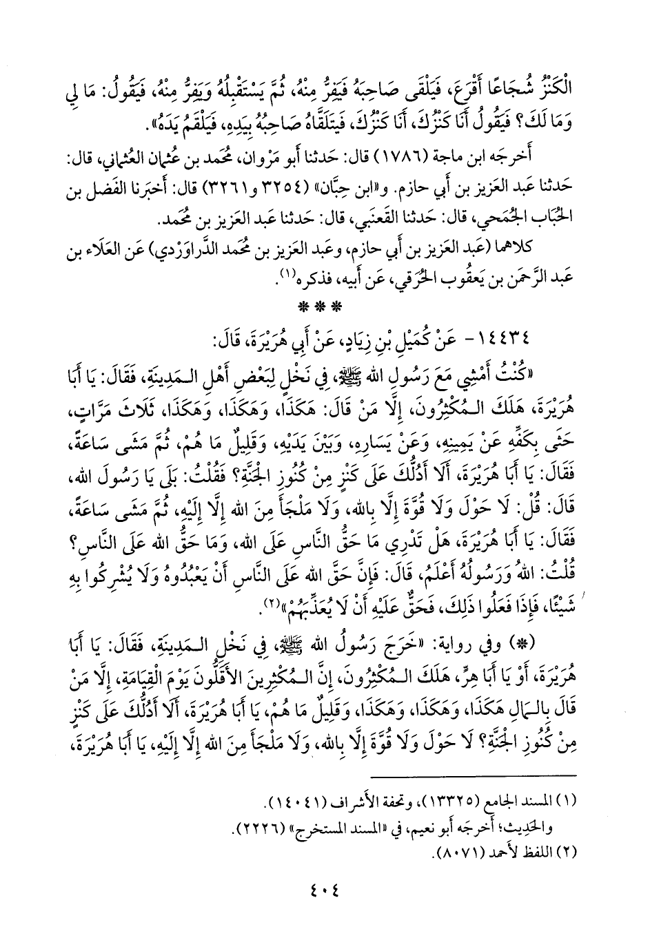 «كنت أمشي مع رسول الله صَلى الله عَليه وسَلم في نخل لبعض أهل المدينة، فقال: يا أبا هريرة، هلك المكثرون، إلا من قال: هكذا، وهكذا، وهكذا، ثلاث مرات، حثى بكفه عن يمينه، وعن يساره، وبين يديه، وقليل ما هم، ثم مشى ساعة، فقال: يا أبا هريرة، ألا أدلك على كنز من كنوز الجنة؟ فقلت: بلى يا رسول الله، قال: قل: لا حول ولا قوة إلا بالله، ولا ملجأ من الله إلا إليه، ثم مشى ساعة، فقال: يا أبا هريرة، هل تدري ما حق الناس على الله، وما حق الله على الناس؟ قلت: الله ورسوله أعلم، قال: فإن حق الله على الناس أن يعبدوه ولا يشركوا به شيئا، فإذا فعلوا ذلك، فحق عليه أن لا يعذبهم» (¬١).