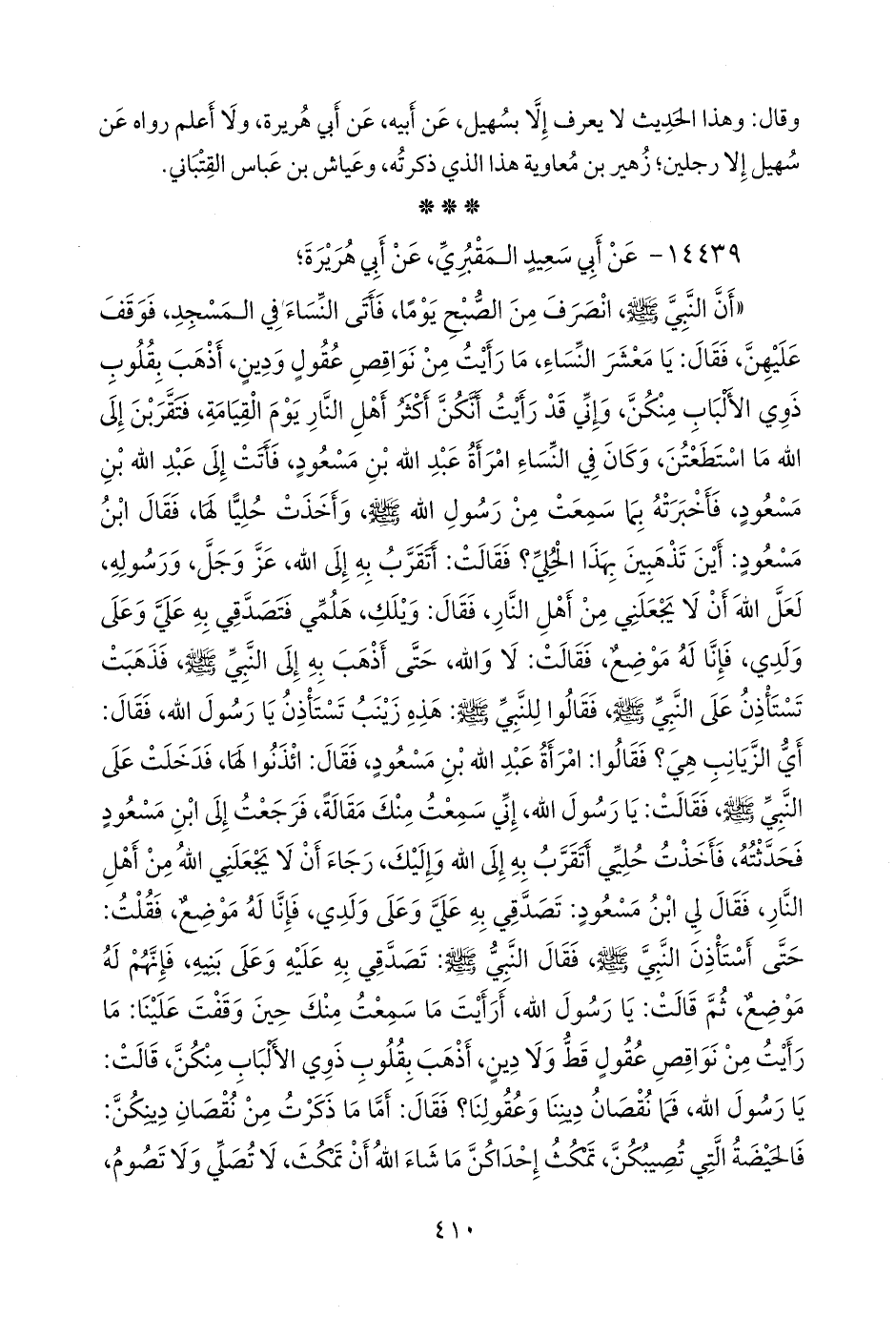 «أن النبي صَلى الله عَليه وسَلم انصرف من الصبح يوما، فأتى النساء في المسجد، فوقف عليهن، فقال: يا معشر النساء، ما رأيت من نواقص عقول ودين، أذهب بقلوب ذوي الألباب منكن، وإني قد رأيت أنكن أكثر أهل النار يوم القيامة، فتقربن إلى الله ما استطعتن، وكان في النساء امرأة عبد الله بن مسعود، فأتت إلى عبد الله بن مسعود، فأخبرته بما سمعت من رسول الله صَلى الله عَليه وسَلم وأخذت حليا لها، فقال ابن مسعود: أين تذهبين بهذا الحلي؟ فقالت: أتقرب به إلى الله، عز وجل، ورسوله، لعل الله أن لا يجعلني من أهل النار، فقال: ويلك، هلمي فتصدقي به علي وعلى ولدي، فإنا له موضع، فقالت: لا والله، حتى أذهب به إلى النبي صَلى الله عَليه وسَلم فذهبت تستاذن على النبي صَلى الله عَليه وسَلم فقالوا للنبي صَلى الله عَليه وسَلم: هذه زينب تستاذن يا رسول الله، فقال: أي الزيانب هي؟ فقالوا: امرأة عبد الله بن مسعود، فقال: ائذنوا لها، فدخلت على النبي صَلى الله عَليه وسَلم فقالت: يا رسول الله، إني سمعت منك مقالة، فرجعت إلى ابن مسعود فحدثته، فأخذت حليي أتقرب به إلى الله وإليك، رجاء أن لا يجعلني الله من أهل النار، فقال لي ابن مسعود: تصدقي به علي وعلى ولدي، فإنا له موضع، فقلت: حتى أستاذن النبي صَلى الله عَليه وسَلم فقال النبي صَلى الله عَليه وسَلم: تصدقي به عليه وعلى بنيه، فإنهم له موضع، ثم قالت: يا رسول الله، أرأيت ما سمعت منك حين وقفت علينا: ما رأيت من نواقص عقول قط ولا دين، أذهب بقلوب ذوي الألباب منكن، قالت: يا رسول الله، فما نقصان ديننا وعقولنا؟ فقال: أما ما ذكرت من نقصان دينكن: فالحيضة التي تصيبكن، تمكث إحداكن ما شاء الله أن تمكث، لا تصلي ولا تصوم،