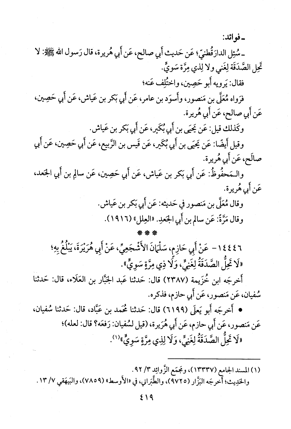 - وسُئل الدارقُطني؛ عن حديث أبي صالح، عن أبي هريرة، قال رسول الله صَلى الله عَليه وسَلم: لا تحل الصدقة لغني ولا لذي مرة سوي.