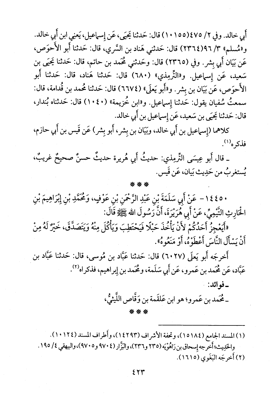 وفي ٢/ ٤٧٥ (١٠١٥٥) قال: حدثنا يحيى، عن إسماعيل، يعني ابن أبي خالد. و «مسلم» ٣/ ٩٦ (٢٣٦٤) قال: حدثني هَنَّاد بن السَّري، قال: حدثنا أَبو الأحوص، عن بيان أبي بشر. وفي (٢٣٦٥) قال: وحدثني محمد بن حاتم، قال: حدثنا يحيى بن سعيد، عن إسماعيل. و «التِّرمِذي» (٦٨٠) قال: حدثنا هَنَّاد، قال: حدثنا أَبو الأحوص، عن بيان بن بشر. و «أَبو يَعلى» (٦٦٧٤) قال: حدثنا محمد بن قُدَامة، قال: سمعت سفيان يقول: حدثنا إسماعيل. و «ابن خزيمة» (١٠٤٠) قال: حدثناه بُندَار، قال: حدثنا يحيى بن سعيد، عن إسماعيل بن أبي خالد.