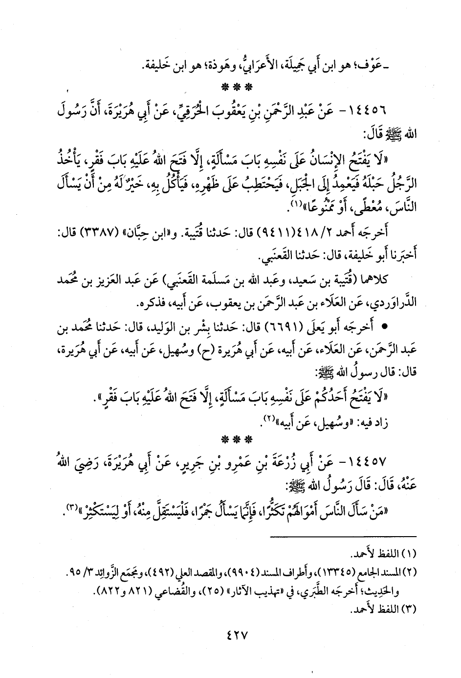 ١٤٤٥٧ - عن أَبي زُرعَة بن عَمرو بن جرير، عن أبي هريرة، رضي الله عنه، قال: قال رسول الله صَلى الله عَليه وسَلم: