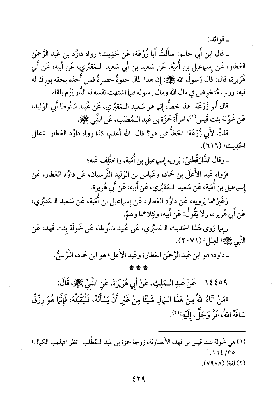 - قال عبد الرَّحمَن بن أبي حاتم الرازي: سألت أَبا زُرعَة، عن حديث؛ رواه داود بن عبد الرَّحمَن العطار، عن إسماعيل بن أُمية، عن سعيد بن أبي سعيد المَقبُري، عن أبيه، عن أبي هريرة، قال: قال رسول الله صَلى الله عَليه وسَلم: إن هذا المال حلوة خضرة فمن أخذه بحقه بورك له فيه، ورب متخوض في مال الله ومال رسوله فيما اشتهت نفسه له النار يوم يلقاه.