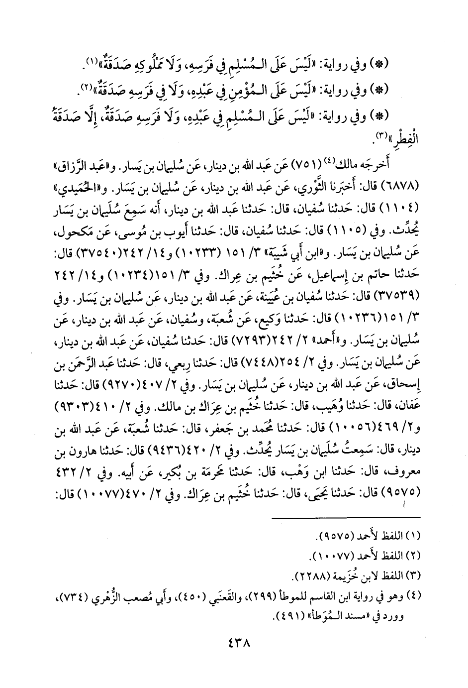 حدثنا عبد الرَّحمَن، عن سفيان، عن عبد الله بن دينار، عن سليمان بن يسار. وفي ٢/ ٤٧٧ (١٠١٩٠) قال: حدثنا وكيع، قال: حدثنا سفيان، وشعبة، عن عبد الله بن دينار، عن سليمان بن يسار. و «الدَّارِمي» (١٧٥٥) قال: أخبرنا هاشم بن القاسم، قال: حدثنا شعبة، قال: عبد الله بن دينار أخبرني، قال: سمعت سليمان بن يسار يحدث.