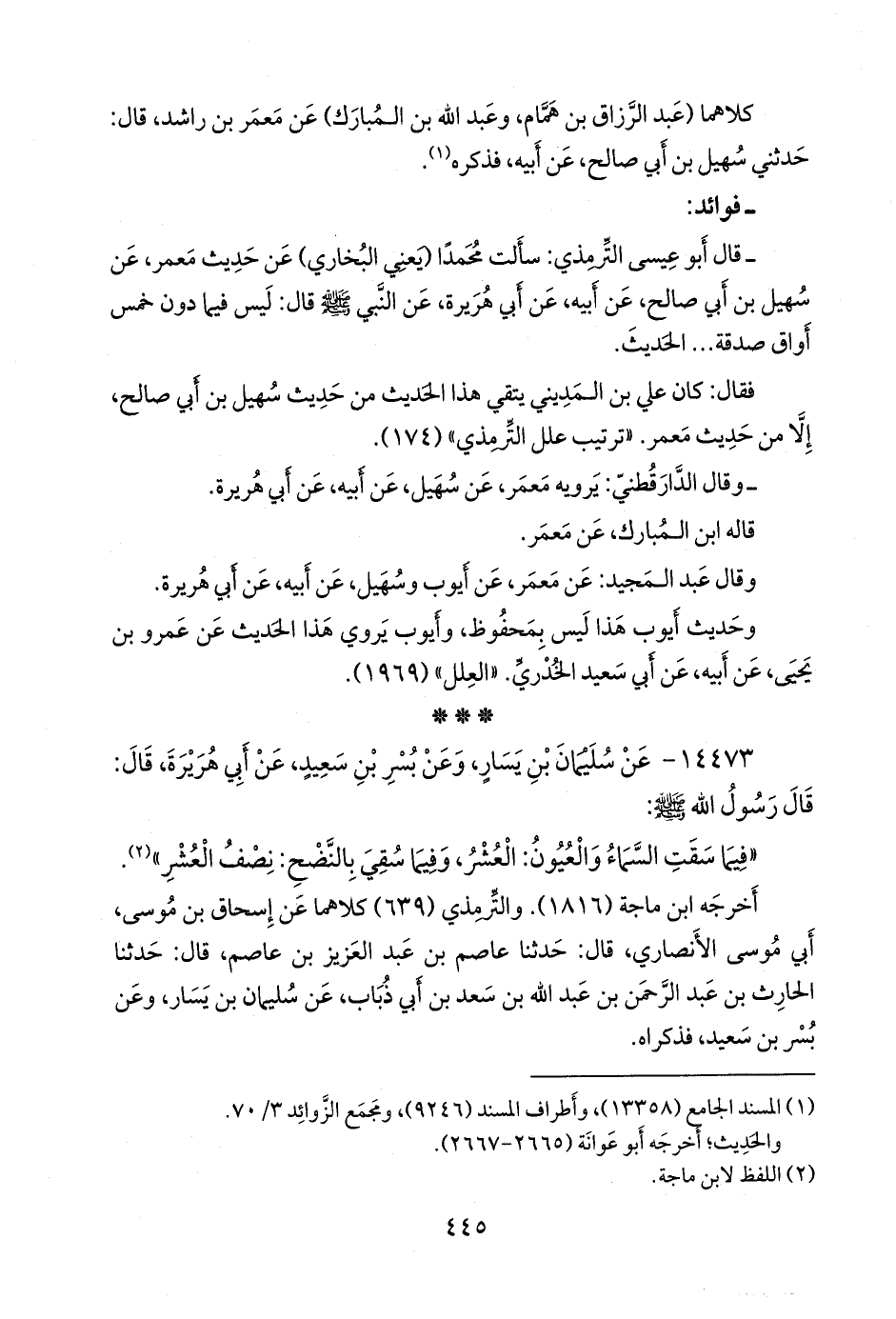 - قال التِّرمِذي: سألتُ محمدًا، يعني ابن إسماعيل البخاري، عن حديث معمر، عن سهيل بن أبي صالح، عن أبيه، عن أبي هريرة، عن النبي صَلى الله عَليه وسَلم قال: ليس فيما دون خمس أوَاقٍ صدقة، الحديث.