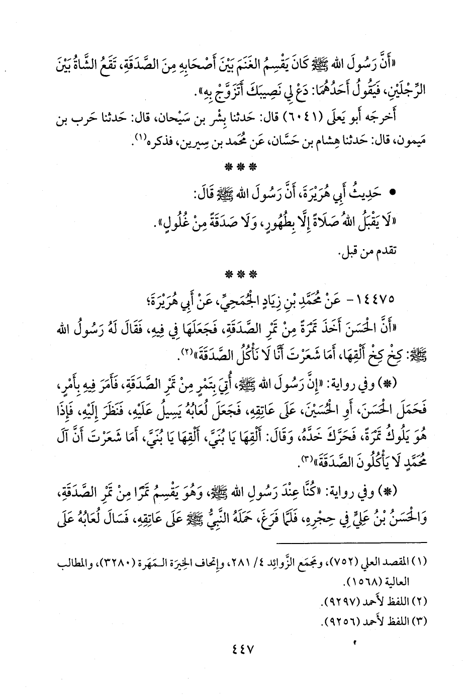 - وفي رواية: «كان رسول الله صَلى الله عَليه وسَلم يؤتى بالتمر عند صرام النخل، فيجيء هذا بتمره وهذا من تمره، حتى يصير عنده كوما من تمر، فجعل الحسن والحسين، رضي الله عنهما، يلعبان بذلك التمر، فأخذ أحدهما تمرة، فجعلها في فيه، فنظر إليه رسول الله صَلى الله عَليه وسَلم فأخرجها من فيه، فقال: أما علمت أن آل محمد صَلى الله عَليه وسَلم لا ياكلون الصدقة» (¬٤).