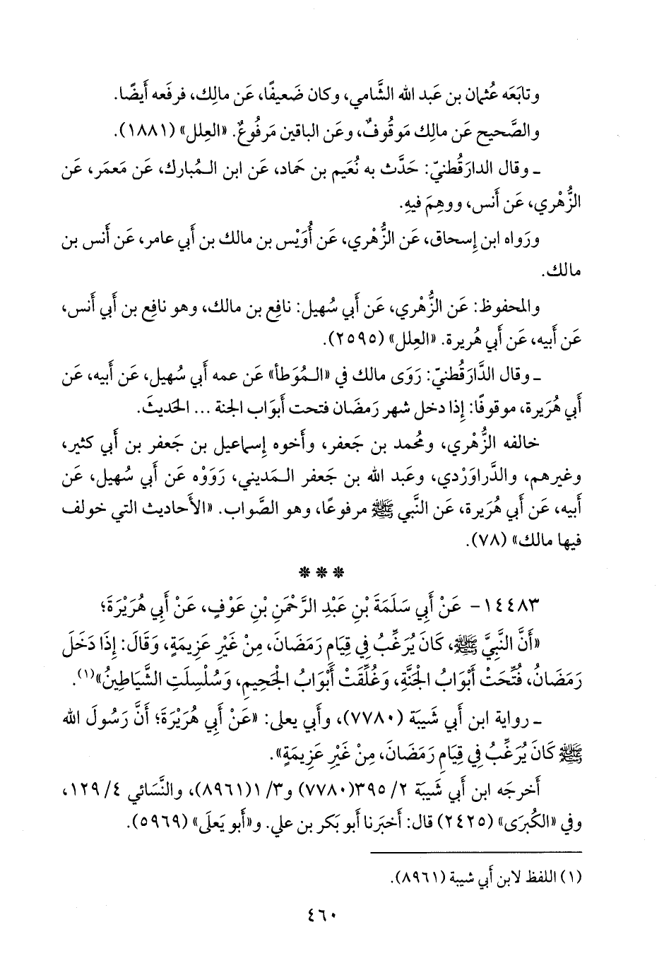 - رواية ابن أبي شيبة (٧٧٨٠)، وأبي يَعلى: «عن أبي هريرة؛ أن رسول الله صَلى الله عَليه وسَلم كان يرغب في قيام رمضان، من غير عزيمة».
