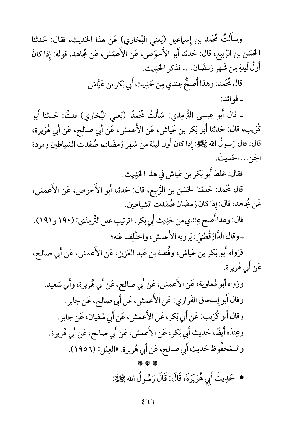 - قال التِّرمِذي: سألتُ محمدًا، يعني ابن إسماعيل البخاري، قلت: حدثنا أَبو كُريب، قال: حدثنا أَبو بكر بن عياش، عن الأعمش، عن أبي صالح، عن أبي هريرة، قال: قال رسول الله صَلى الله عَليه وسَلم: إذا كان أول ليلة من شهر رمضان، صفدت الشياطين ومردة الجن، الحديث.