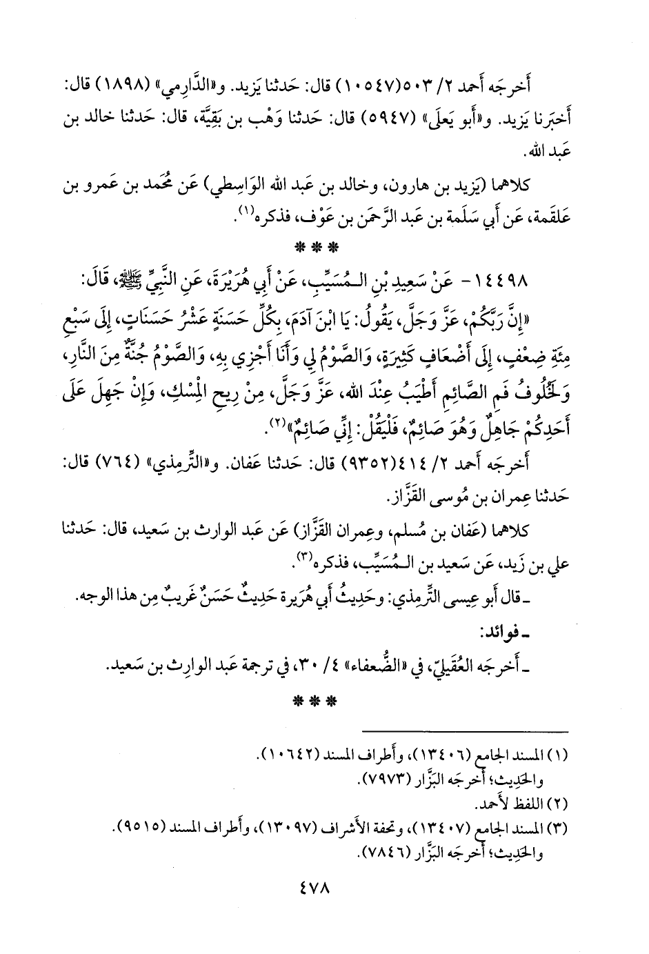 كلاهما (عفان بن مسلم، وعمران القزاز) عن عبد الوارث بن سعيد، قال: حدثنا علي بن زيد، عن سعيد بن المُسَيب، فذكره (¬٢).