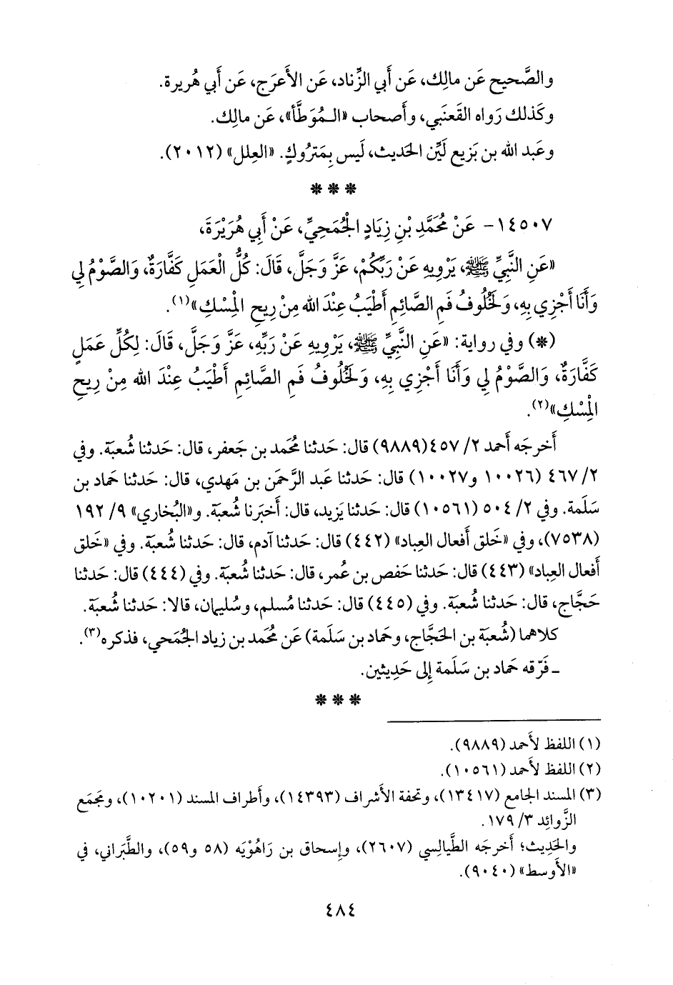 أخرجه أحمد (٩٨٨٩) قال: حدثنا محمد بن جعفر، قال: حدثنا شعبة. وفي ٢/ ٤٦٧ (١٠٠٢٦ و ١٠٠٢٧) قال: حدثنا عبد الرَّحمَن بن مهدي، قال: حدثنا حماد بن سلمة. وفي ٢/ ٥٠٤ (١٠٥٦١) قال: حدثنا يزيد، قال: أخبرنا شعبة. و «البخاري» ٩/ ١٩٢ (٧٥٣٨)، وفي «خلق أفعال العباد» (٤٤٢) قال: حدثنا آدم، قال: حدثنا شعبة. وفي «خلق أفعال العباد» (٤٤٣) قال: حدثنا حفص بن عمر، قال: حدثنا شعبة. وفي (٤٤٤) قال: حدثنا حجاج، قال: حدثنا شعبة. وفي (٤٤٥) قال: حدثنا مسلم، وسليمان، قالا: حدثنا شعبة.