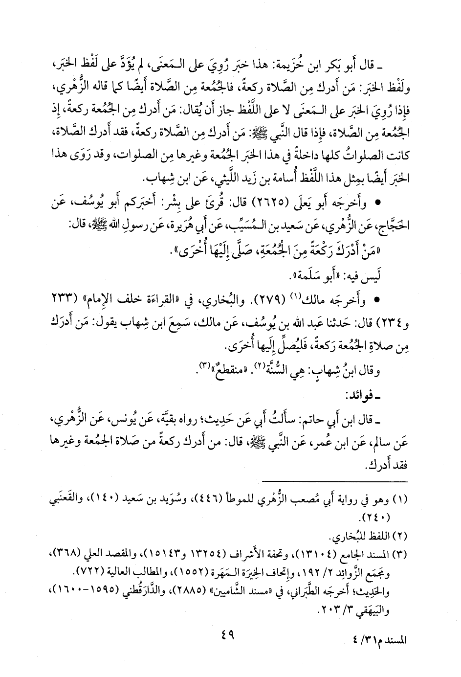 وفي ٦/ ٥٣٧، من طريق عبد الرزاق بن عمر الدمشقي، عن الزُّهْري، عن سعيد بن المُسَيب، عن أبي هريرة، وقال: وهذا بهذا الإسناد عن الزُّهْري، عن سعيد، لا يقول: من أدرك من الجمعة ركعة، إلا ضعيف، والثقات يقولون: من أدرك من الصلاة ركعة.