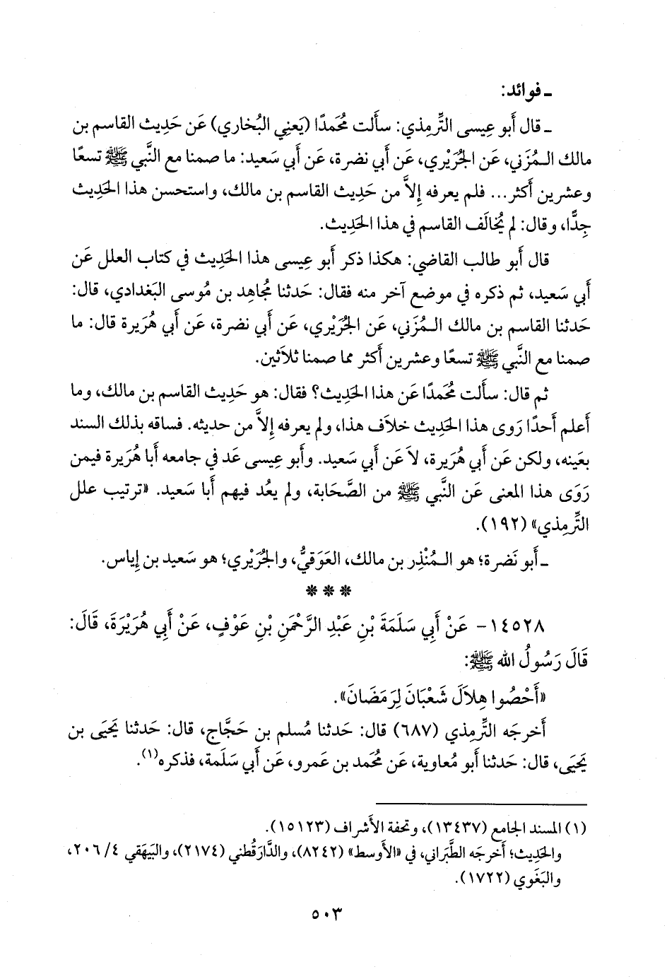 - قال التِّرمِذي: سألتُ محمدًا، يعني ابن إسماعيل البخاري، عن حديث القاسم بن مالك المزني، عن الجُريري، عن أبي نضرة، عن أبي سعيد: ما صمنا مع النبي صَلى الله عَليه وسَلم تسعا وعشرين أكثر ....