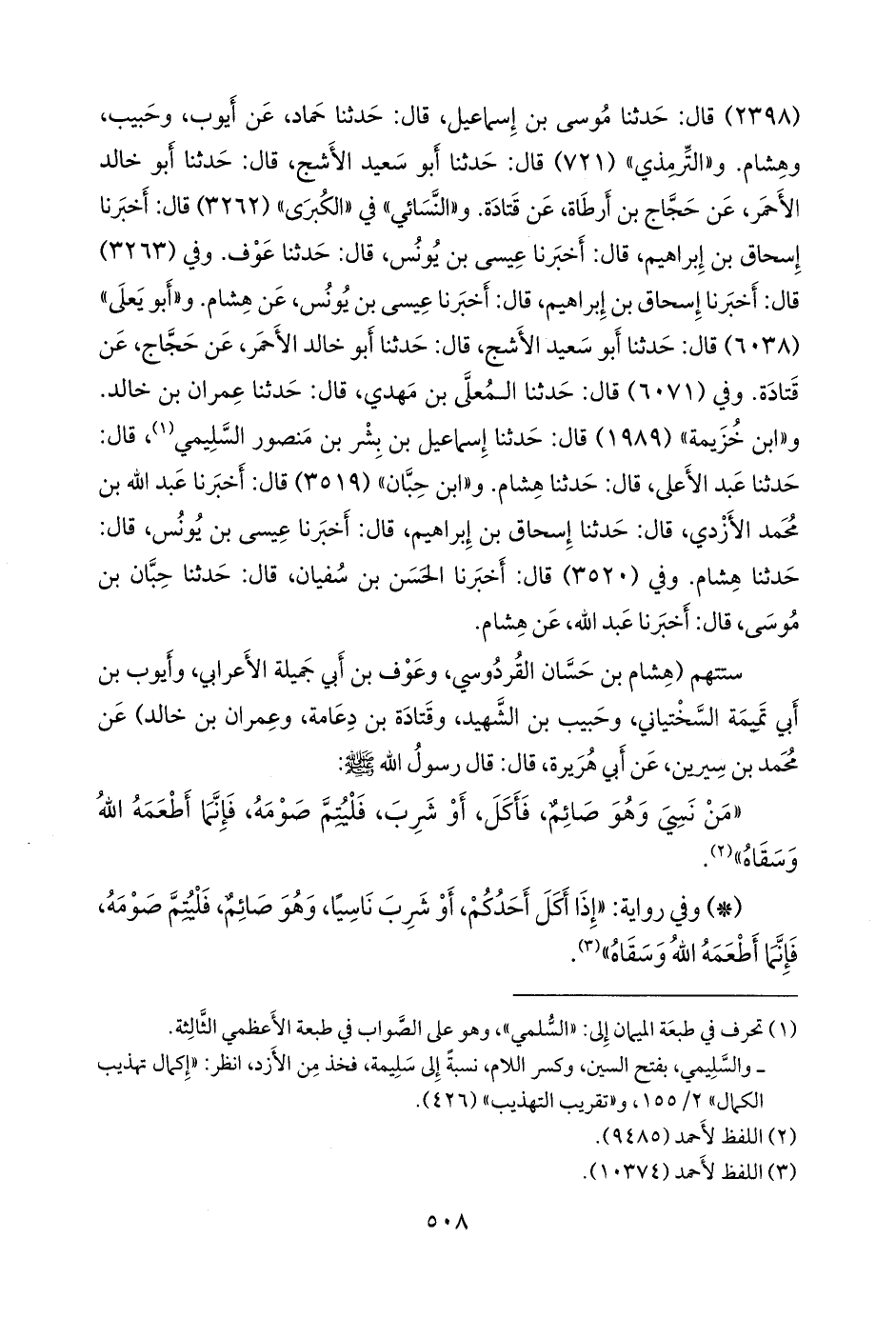 و «التِّرمِذي» (٧٢١) قال: حدثنا أَبو سعيد الأشج، قال: حدثنا أَبو خالد الأحمر، عن حجاج بن أَرطَاة، عن قتادة. و «النَّسَائي» في «الكبرى» (٣٢٦٢) قال: أخبرنا إسحاق بن إبراهيم، قال: أخبرنا عيسى بن يونس، قال: حدثنا عوف. وفي (٣٢٦٣) قال: أخبرنا إسحاق بن إبراهيم، قال: أخبرنا عيسى بن يونس، عن هشام. و «أَبو يَعلى» (٦٠٣٨) قال: حدثنا أَبو سعيد الأشج، قال: حدثنا أَبو خالد الأحمر، عن حجاج، عن قتادة. وفي (٦٠٧١) قال: حدثنا المعلى بن مهدي، قال: حدثنا عمران بن خالد. و «ابن خزيمة» (١٩٨٩) قال: حدثنا إسماعيل بن بشر بن منصور السليمي (¬١)، قال: حدثنا عبد الأعلى، قال: حدثنا هشام. و «ابن حِبَّان» (٣٥١٩) قال: أخبرنا عبد الله بن محمد الأزدي، قال: حدثنا إسحاق بن إبراهيم، قال: أخبرنا عيسى بن يونس، قال: حدثنا هشام. وفي (٣٥٢٠) قال: أخبرنا الحسن بن سفيان، قال: حدثنا حِبَّان بن موسى، قال: أخبرنا عبد الله، عن هشام.