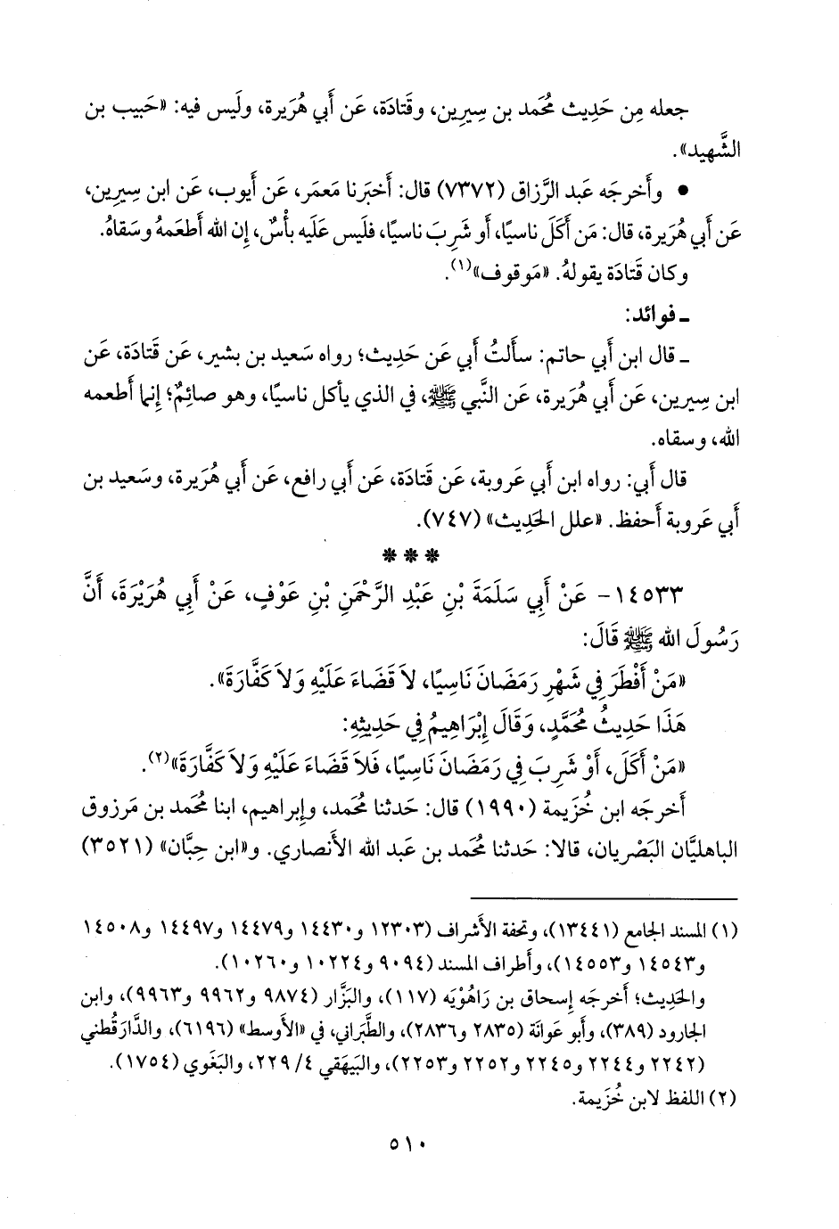 - قال ابن أبي حاتم: سألت أبي عن حديث؛ رواه سعيد بن بشير، عن قتادة، عن ابن سِيرين، عن أبي هريرة، عن النبي صَلى الله عَليه وسَلم في الذي يأكل ناسيا، وهو صائم؛ إنما أطعمه الله، وسقاه.